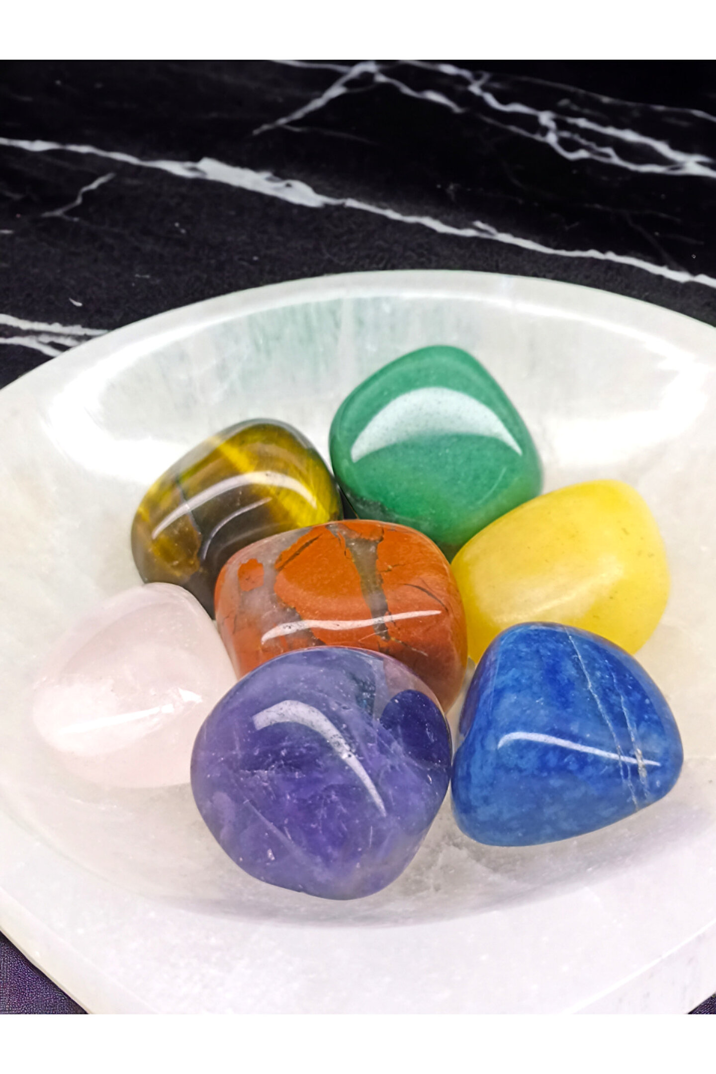 DOĞAL TAŞ CENNETİ Selenit Kase Arındırma Taşı VE ÇAKRA SET TIMBIL (ASA)(SERTİFİKALI)