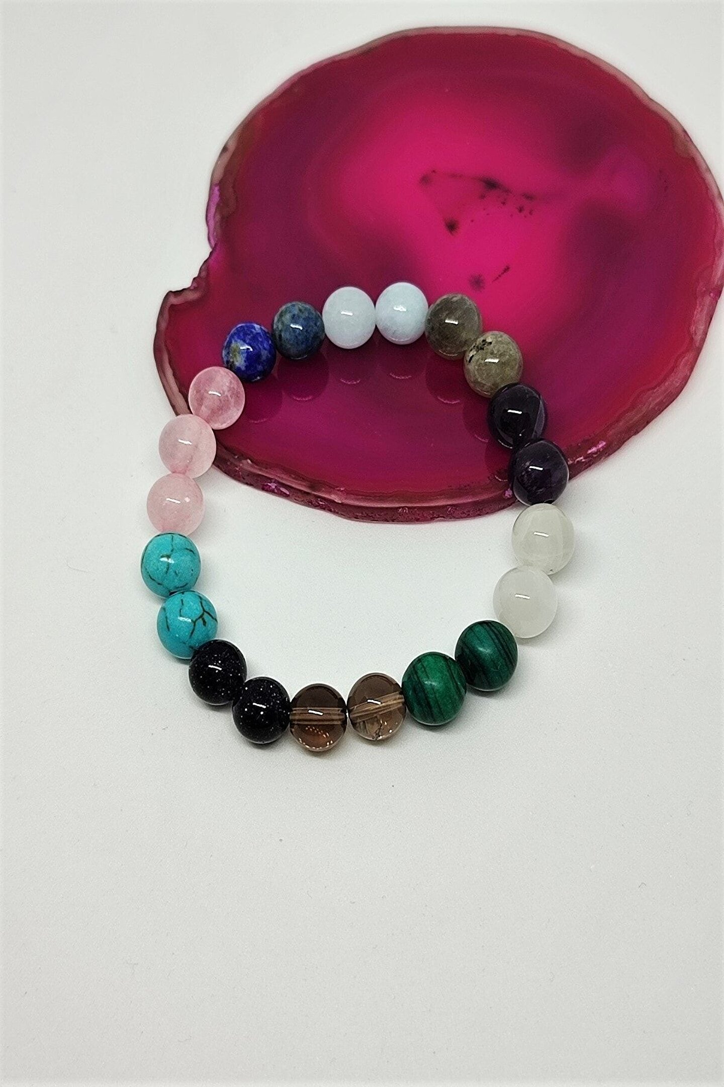 Akuamarin, Labradorit, Ametist, Aytaşı, Malahit, Kuvars, Turkuaz ve Lapis Lazuli gibi doğal taşlardan oluşan bu bileklik, doğanın zarifliğini ve enerjisini parmaklarınıza taşır; Her bir bileklik, benzersiz ve otantik bir görünüm sunarak stilinizi tamamlar ve kişisel tarzınıza eşsiz bir dokunuş katar; Sertifikalı doğaltaş kullanımı, ürünün orijinalliğini ve kalitesini garanti eder; böylece her takı parçasında güvenle kullanabilirsiniz; Doğal taşların renk ve desen çeşitliliği ile her biri farklı bir hikaye anlatır; bu bileklik, her gün farklı bir hikaye anlatmanız için idealdir;