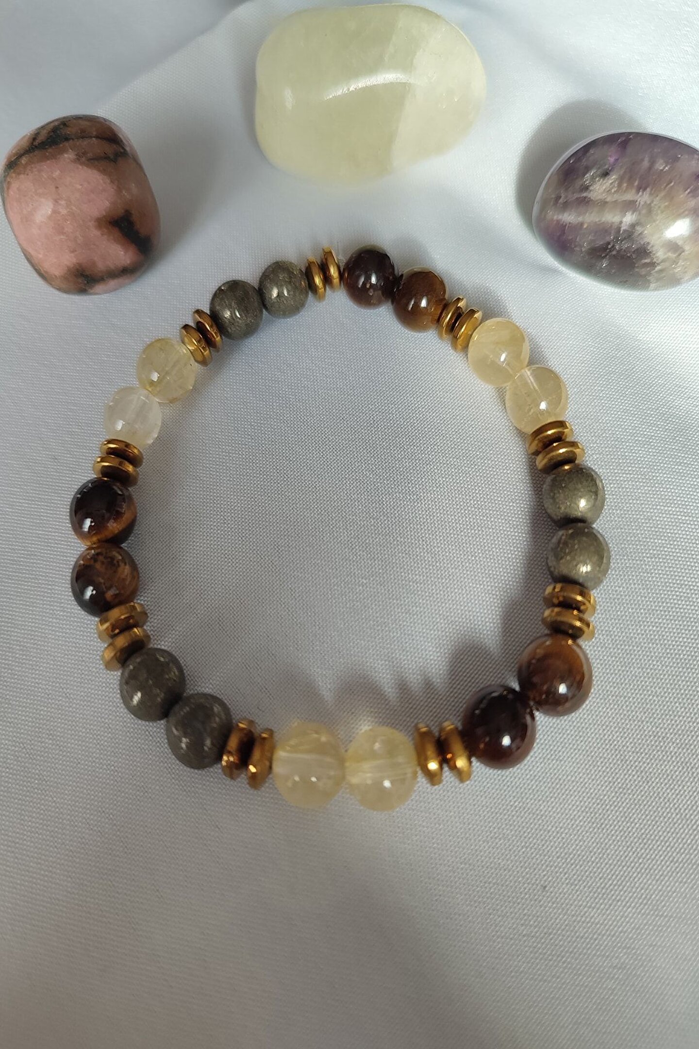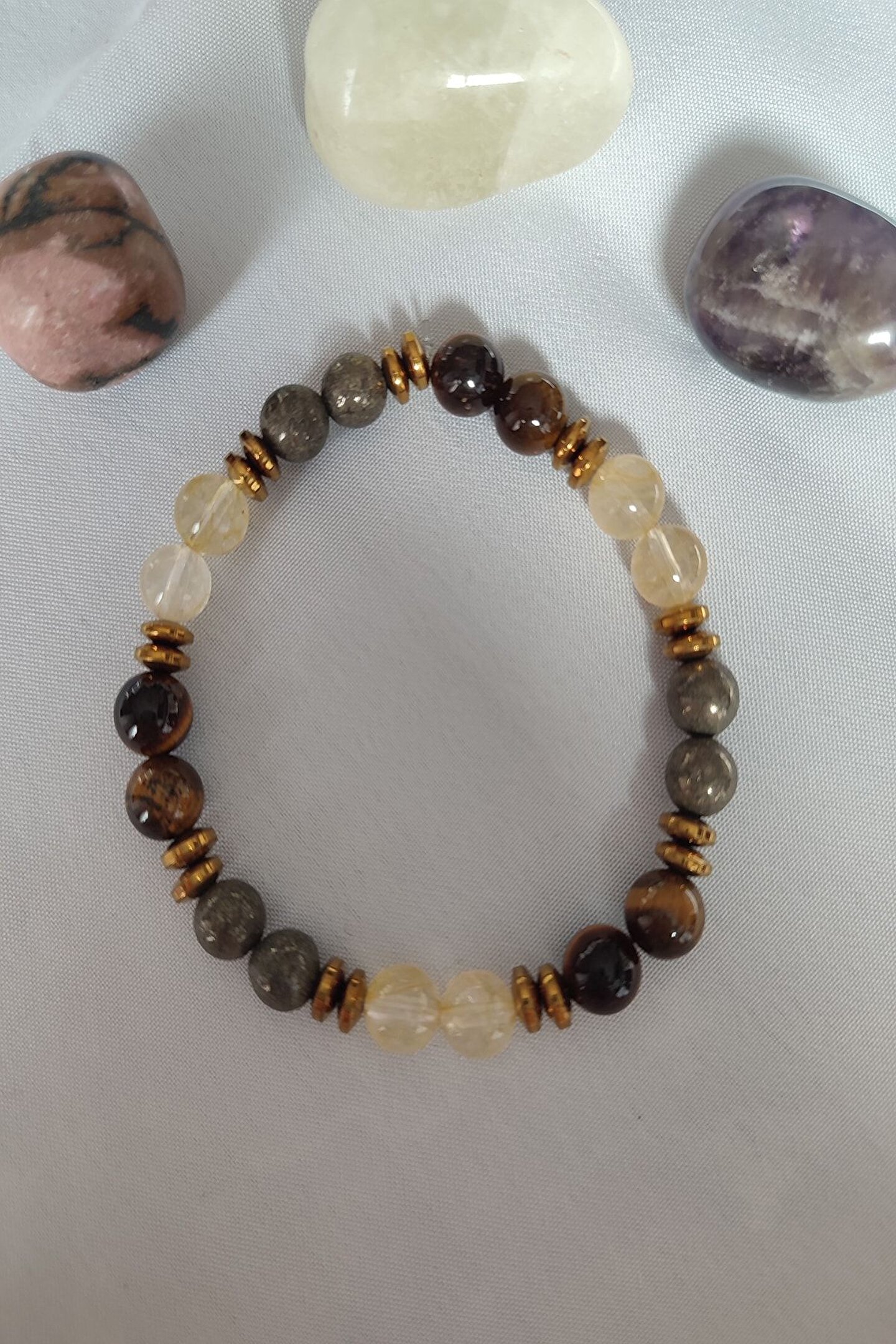 - Doğal taş kullanımı sayesinde her bileklik benzersiz ve otantik bir görünüm sunar; - Sitrin, ve kaplan gözü hematit gibi değerli taşların birleşimiyle zenginleştirilmiş tasarım, şıklığınızı tamamlar; - Hem dayanıklı hem de estetik açıdan hoş olan bu bileklik, günlük kullanım için idealdir; - Doğal taşların eşsiz dokusu ve renkleriyle dikkat çeken bu bileklik, her türlü kıyafetle uyum sağlar;
