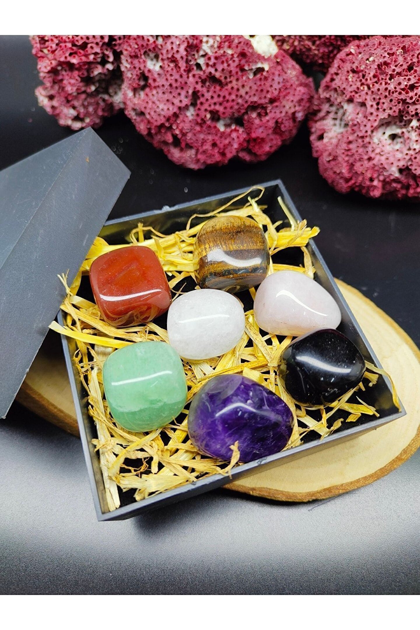 (GÖRSELDE YER ALAN TOPLAM YEDİ ADET TAŞ GÖNDERİLECEKTİR, SETİN TOPLAM AĞIRLIĞI 140-150 GRAM ARASINDA DEĞİŞMEKTEDİR YANİ TAŞ BAŞINA ORTALAMA 20 GRAM BANDINDADIR.; ; TAŞLAR GERÇEK DOĞAL TAŞ OLUP ŞEKİLSEL OLARAK DEĞİŞİKLİK GÖSTEREBİLİR.; ) -----İÇİNDEKİLER----- -Ametist -Pembe Kuvars -Oniks -Kaplan gözü -Aventurin -Kristal Kuvars -Akik Bütün çakraları açarak kişinin fiziksel ve zihinsel durumunu dengede tutar.; ; Kişiyi huzurlu ve mutlu hissettirir.; ; Kişiyi motive eder ve hayatı sevmesini sağlar.; ; Taşların enerjisini temizlemek için akan suda yıkamanız ya da toprağın altında 24 saat boyunca bekletmeniz yeterli olacaktır.; Firmamız “Taşmir”, yalnızca orijinal ve garanti kapsamındaki ürünleri satışa sunmaktadır.; Site üzerinde bazı satıcılar benzer ürünleri daha düşük fiyatlarla listeleyebilmektedir; ancak bu ürünler orijinallik garantisi taşımamakta ve yan sanayi ürün gönderme riski bulunmaktadır.; Siz değerli müşterilerimizin mağduriyet yaşamaması adına, sadece “Taşmir” mağazasından yapacağınız alışverişlerde ürünlerin orijinalliği ve garantisi firmamız tarafından güvence altına alınmaktadır.; Kaliteli ve güvenilir alışveriş için .; Saygılarımızla, Taşmir
