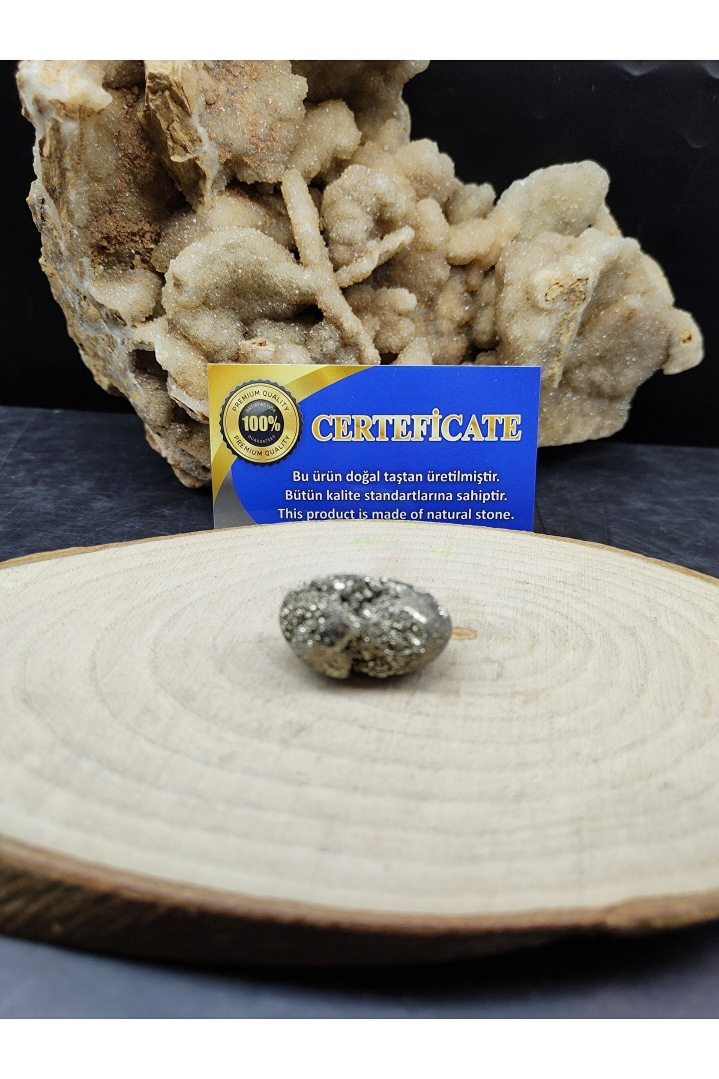 Doğal ham pirit taşı, doğanın saf güzelliğini ev ve ofis dekorasyonunuza taşır; Sertifikalı ürünümüz, kalite ve güvenilirlik açısından sizi temin eder; Dekoratif objelerinizde doğal bir dokunuş yaparak mekanınıza otantik bir hava katar; Ham pirit taşı, benzersiz desenleri ve renkleriyle her türlü dekorasyon stiline uyum sağlar;