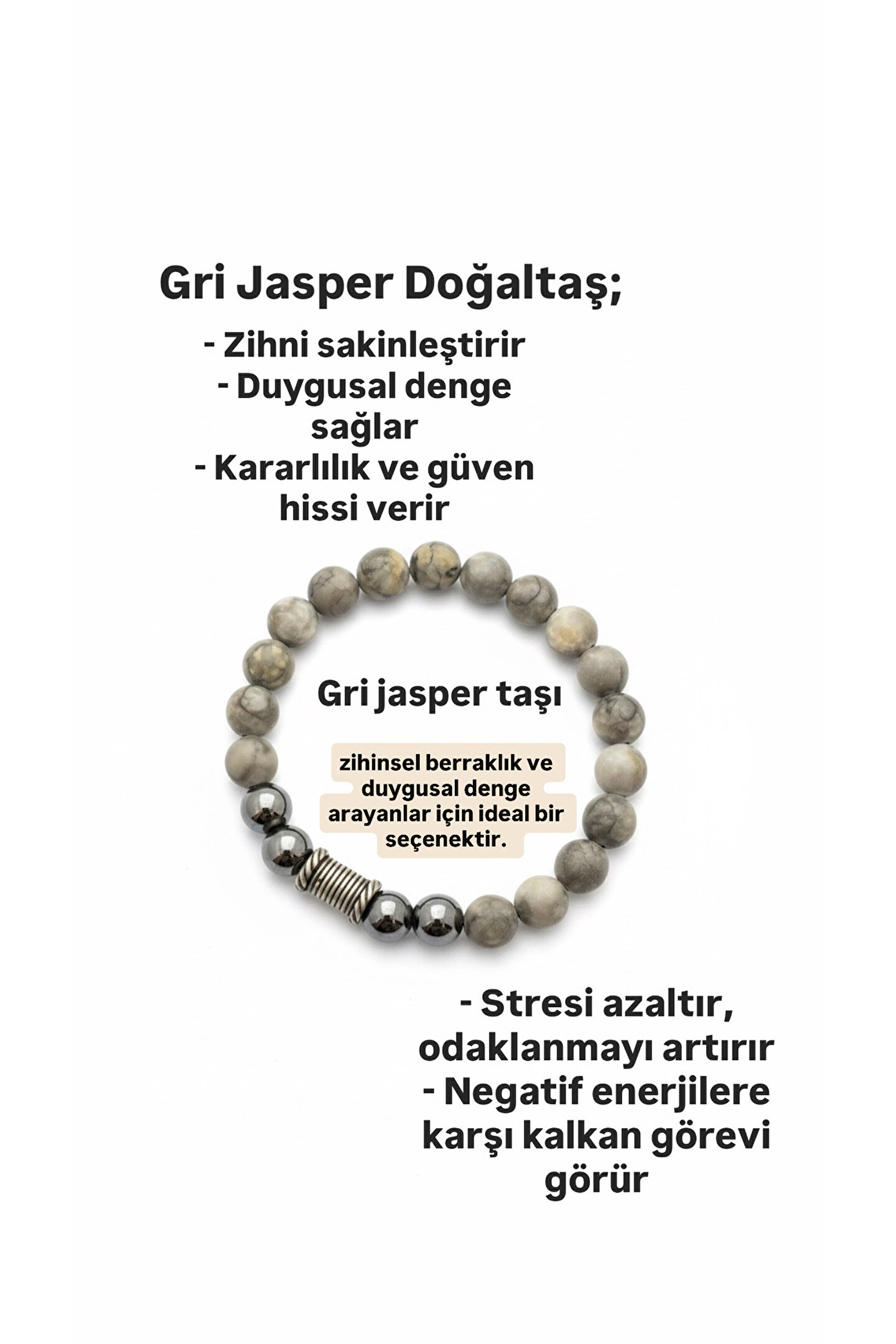 Gri Jasper Doğaltaşı :stresin baskısını azaltır ve gün boyu sizi enerjik tutar.; Günlük kullanım için uygundur.; Özenle dizilmiş 8mm doğal taşlarla hazırlanmıştır.; HEDİYE PAKETİNDE GÖNDERİLİR.
