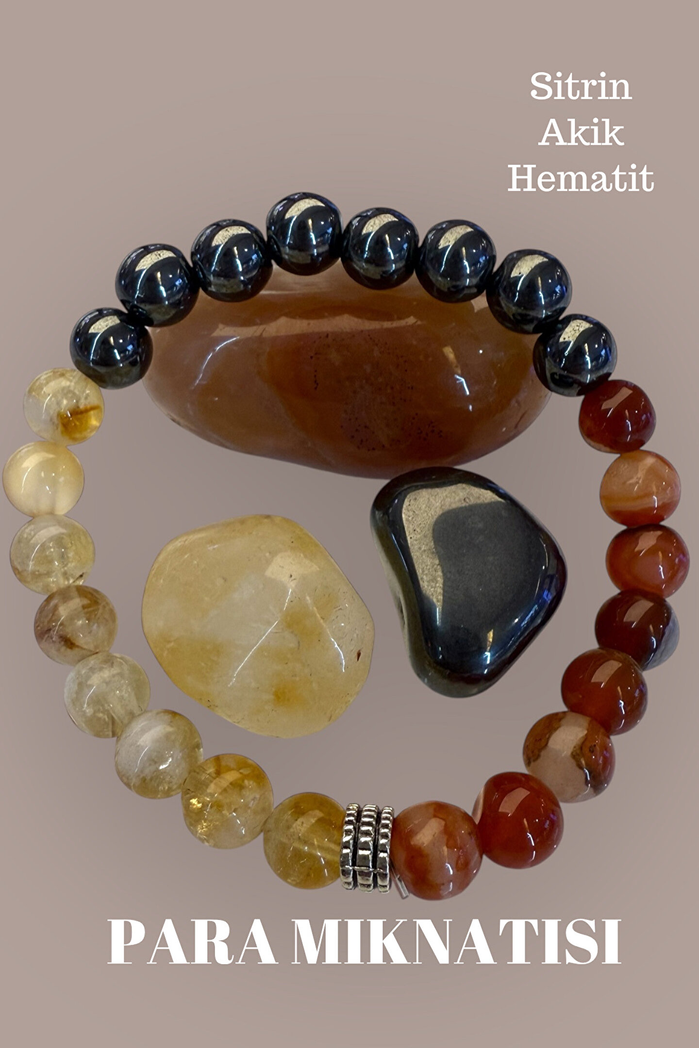 Doğaltaş Para Mıknatısı Bileklik - Sitrin Taşı Akik Taşı Hematit Taşı