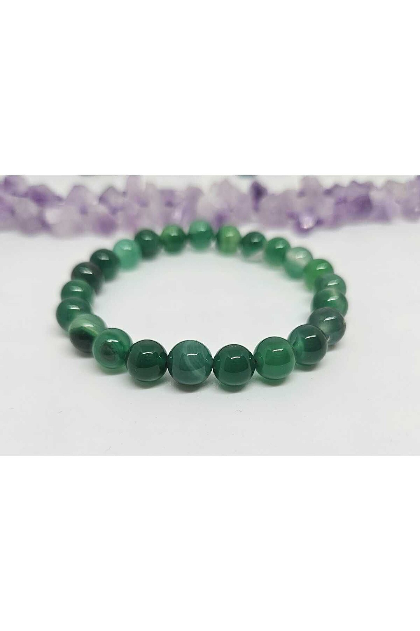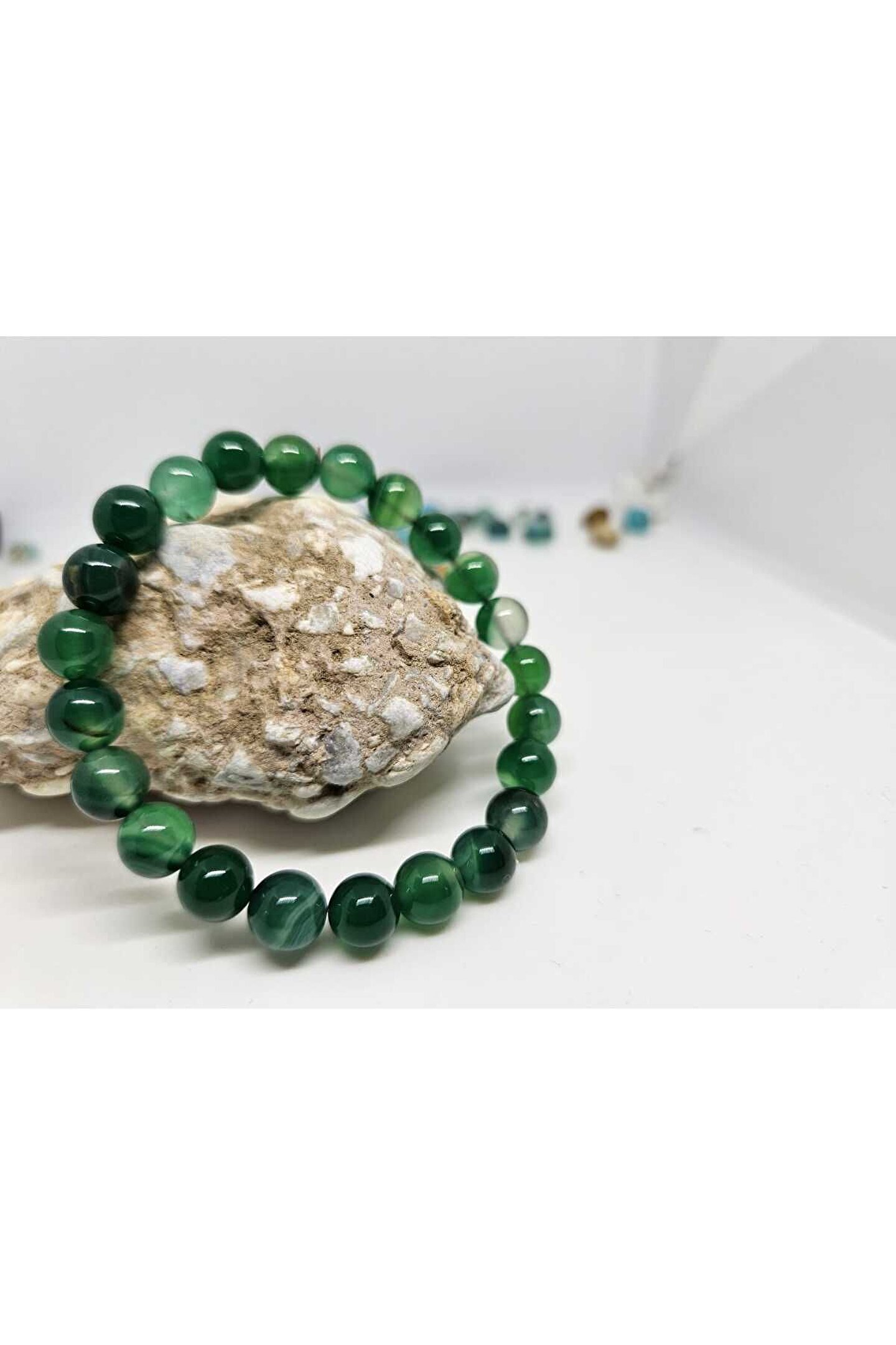Doğal akik taşı kullanılarak üretilmiş, şıklığı ve zarafeti bir arada sunan yeşil akik bileklik; El emeğiyle işlenmiş akik taşı, her bir bileklikte benzersiz desenler ve renk tonları sergiler; Doğal taş materyali sayesinde, her kullanımda farklı bir deneyim yaşatır ve doğanın güzelliklerini bileğinizde taşımanızı sağlar; Yeşil akik taşı, bileklikte kullanılan diğer renklerle uyum sağlayarak, her türlü kıyafetle kolayca kombinlenebilir;