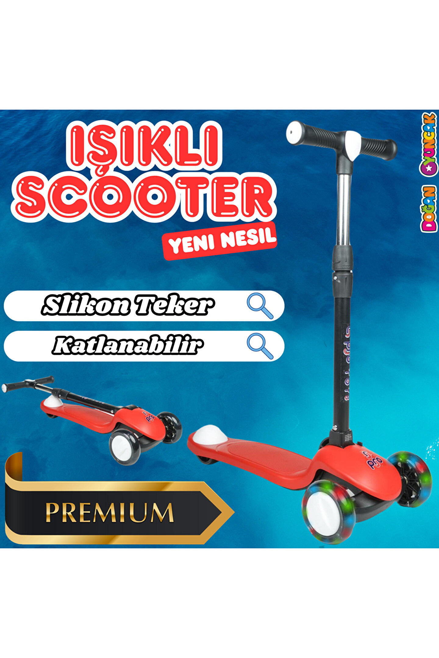 Doğan Oyuncak Dünyası Lupa Katlanabilir Işıklı 3 Tekerlekli Kırmızı Scooter - Işıklı Scooter - Slikon Teker Scooter - Çocu