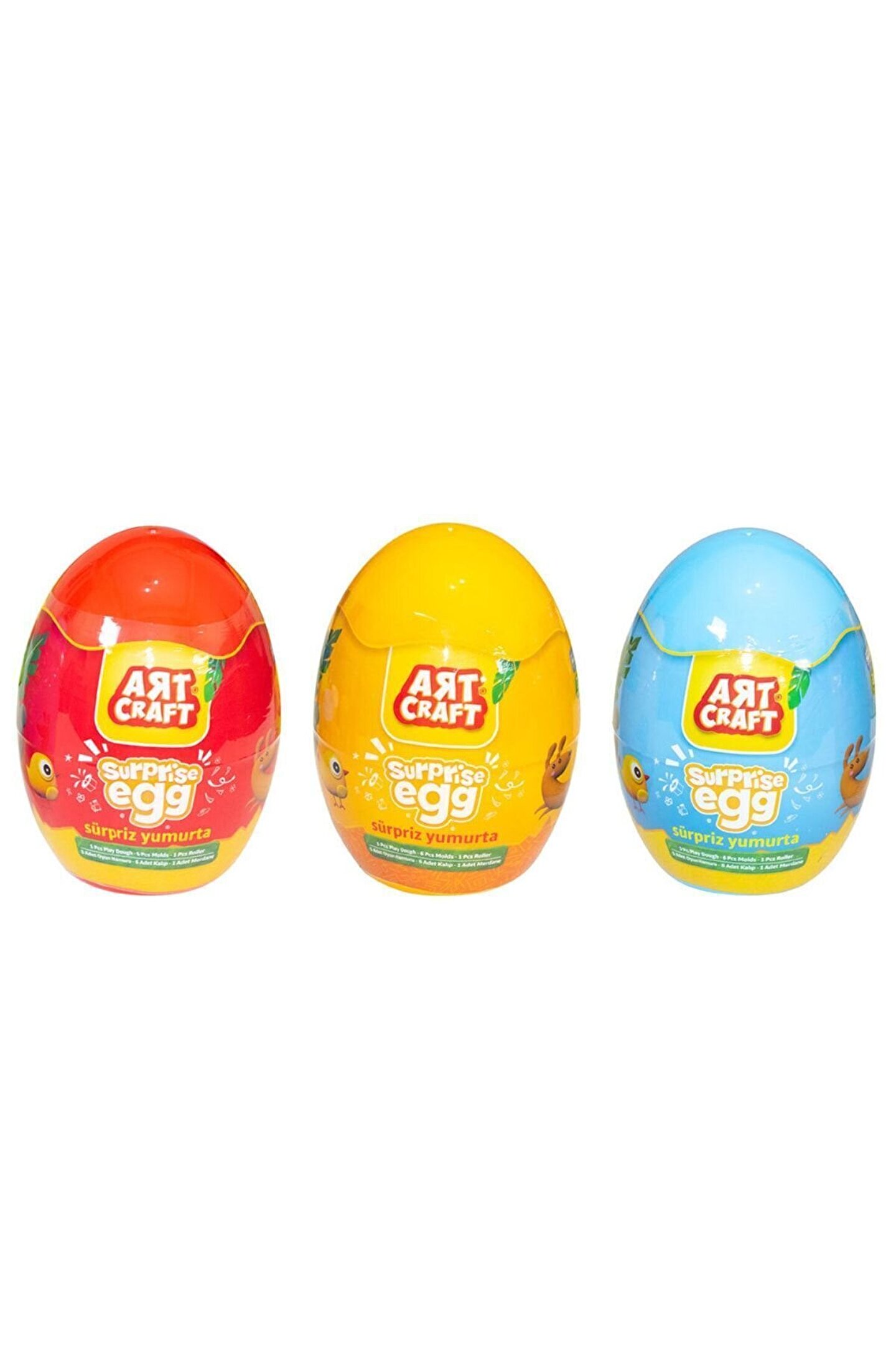 Sürprizler gizli olur! Sürpriz yumurtanın içinden bakalım hangi oyuncak çıkacak? Ürün; 5 adet oyun hamuru, 6 adet kalıp ve 1 adet merdaneden oluşmaktadır. Ürün; 3 yaş altı çocuklar için uygun değildir. Sağlık testlerinden geçmiştir. Yerli üretimdir. Tekli satılmaktadır.