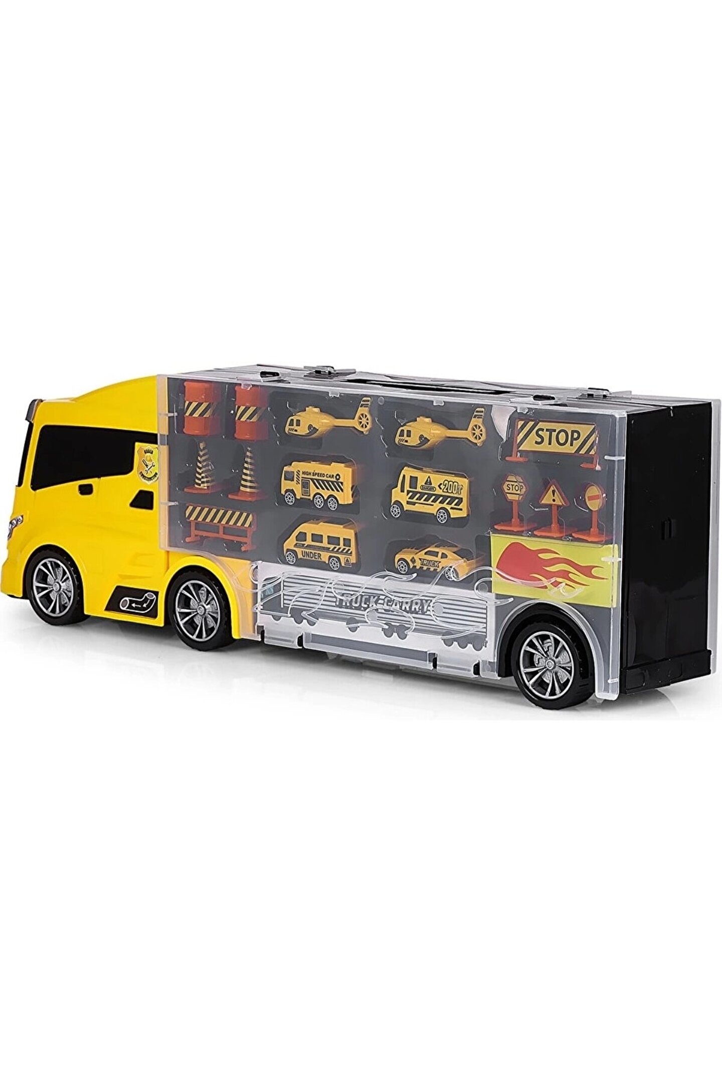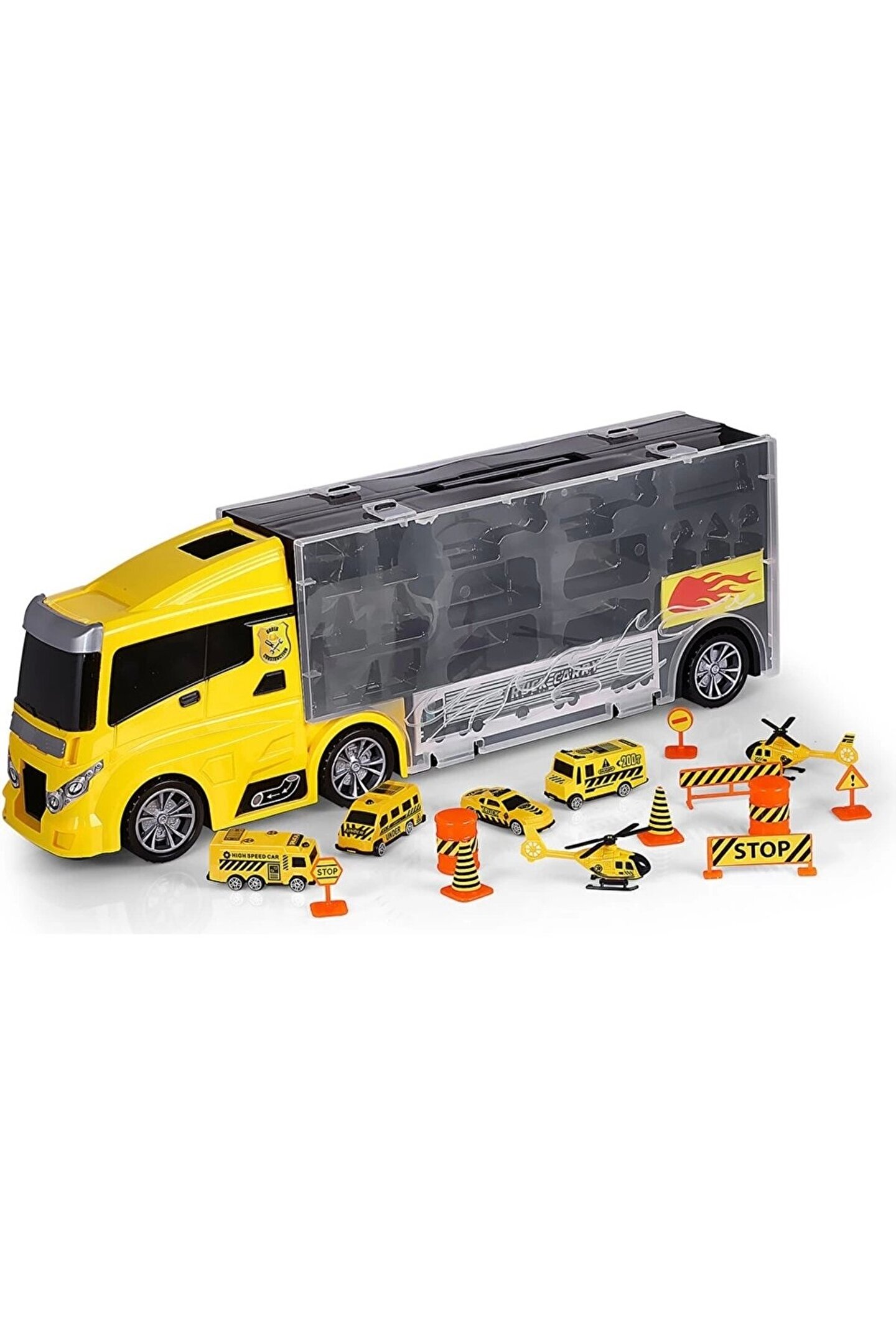 Oyuncak İnşaat Taşıyıcı Tır 15+1 Parça GLT-E404, çocuklar için hem eğlenceli hem de öğretici bir oyuncaktır.; ; Bu İnşaat taşıyıcı tır, 15 araç ve 1 adet İnşaat şehri aracıyla birlikte gelir, böylece çocuklar İnşaat temasını canlandırabilirler.; ; Tır, çeşitli İnşaat araçlarını taşıyabilen geniş bir kasa ile tasarlanmıştır ve detaylı yapısıyla dikkat çeker.; ; Çocuklar, bu oyuncak sayesinde İnşaat operasyonlarını simüle edebilir ve yaratıcı oyun senaryoları oluşturabilirler.; ; Ayrıca, bu set, motor becerilerini geliştirmek ve hayal gücünü artırmak için ideal bir seçenektir.; ; Kutu Boyutu : 63x23x13 Cm; Tırın ön tarafında kaydırak için bir kapak bulunmaktadır.; Dorse ksımının ön tarafından araçları koyup ön tarafından çıkartabiliyorsunuz.; ; Harikalar yaratan bu oyuncağı kim istemez ki!; Haydi sende hem aksesuarı hemde kaydırağı ile meşhur olan bu oyuncağa hemen sahip ol!;