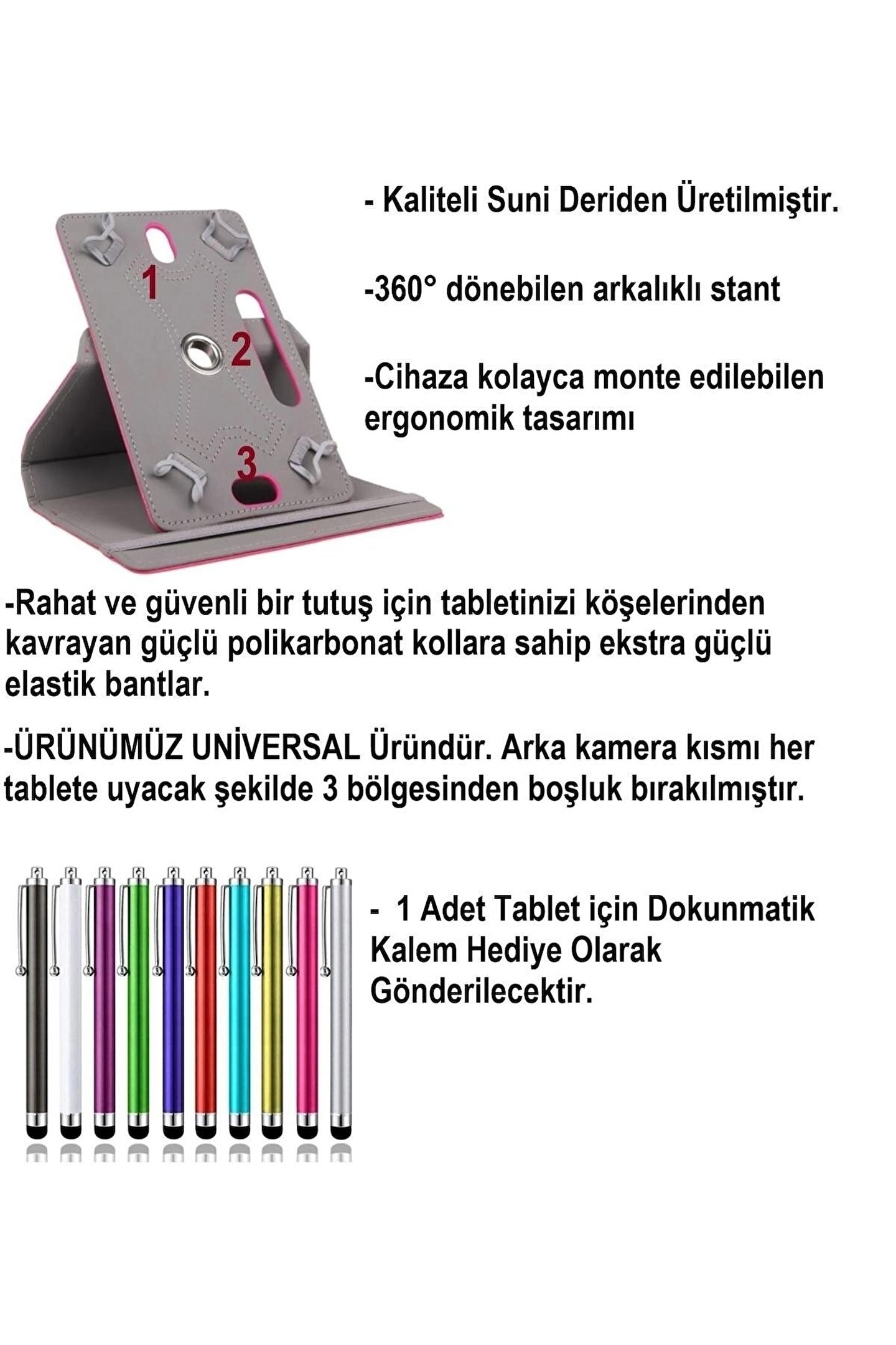 DÖNER STANTLI TABLET KILIFI + NANO KIRILMAZ EKRAN KORUYUCU CAM + DOKUNMATİK KALEM NANO KIRILMAZ EKRAN KORUYUCU CAM ÖZELİKLERİ Ekran koruyucu ilan başlığındaki model ile tam uyumludur. ; Lütfe tablet modelinizden emin olunuz. ; Farklı tablet modelerine uyum sağlamayacaktır. ; • Kırılmaz, Çizilmez, Leke Tutmaz, Yansıma Yapmaz, HD Clear Şeffaf • Nano Teknoloji Ürünü, Tüm Özellikler bir arada, • Devrim Niteliğinde Ultra Güçlü Ekran Koruyucu! • Temperli Kırılmaz Camlara göre Daha İnce ve Daha Sağlamdır. ; • Ekranda film fark edilmez, Dokunmatik ekranı doğal görünümünü korur • Anti-Glare kir tutmaz. ; Parmaz İzi bırakmaz, Işığı yansıtmazdır. ; • HD Clear Şeffaf, Dokunmatik ekranında film yokmuş gibi ekranı kullanabilirsiniz. ; • Yüksek kalite ultra ince şeffaf film materyalden üretilmiştir. ; • Ekranını kir ve darbeden korur, çizilmesini önler Kolayca takıp çıkartılabilir, • Hiçbir etki bırakmaz. ; • Harika kalıp kesimi sayesinde ekrana mükemmel uyar • Uzun ömürlüdür, darbelere karşı maximum korur. ; Tablet Kılıfı Üstün özellikli. ; -Ürün oldukça şık tasarıma sahip olup tabletinizi dış etkenlerden korur... ; - Kullanımı rahat Ergonomik ve zarif tasarımıyla tabletinizi tamamlayacak ve renk katacak bir aksesuardır. ; -Cihaza kolayca monte edilebilen ergonomik tasarımı sayesinde ürün kullanımında herhangi bir zorluk yaşamadan tabletinizin tüm işlevlerini rahatlıkla kullanabilirsiniz. ; -Kılıf tabletinizin darbelerden koruyacağı gibi kirden tozdan muhafaza edilmesine yardımcı olur. ; -Ergonomik şık kalıp kesimi ve esnekliği sayesinde tabletinize kusursuz bir biçimde uyacaktır. ; -Kolaylıkla takılıp çıkarılabilecek son derece şık bir kapaktır sade ve eşsiz tasarımı sayesinde tabletiniz artık güvende ve daha şık. ; -Ürünümüz Kaliteli Suni Deridir Kesinlikle Kalitesiz Çin Ürünlerinden değildir. ; -Kullanımı Kolay Ergonomiktir. ; Dönebilen yapısı ile yan ve dik olarak stand olarak kullanabilirsiniz. ; Tablet kullanımında önemli olan cihazınızı stand konumunda sağlam olarak kullanabilmektir.Bu üründe bu mümkündür. ; Kademeli stand özelliği ile istenilen düzeyde yataylık sağlanabilir. ; Cihaz kılıf içerisindeki kısma oturtularak kullanılır. ; Farklı renk seçenekleri ile sizlerle Artık diğer kılıflara dünyanın servetini ödemeyi gerek bıraktırmayan kılıflarımızı gönül rahatlığı ile kullanabilirsiniz. ; NOT: ÜRÜNÜMÜZ UNİVERSAL Üründür. ; Arka kamera kısmı her tablete uyacak şekilde 3 BÖLGESİNDEN boşluk bırakılmıştır. ; Bazı tabletler kamera boşlukları denk gelmeyebilir. ; NOT: HEDİYE OLARA GÖNDERMİŞ OLDUĞUMUZ DOKUNMATİK KALEM RENGİ VE MODELİ STOK DURUMUNA GÖRE DEĞİŞEBİİLİR;