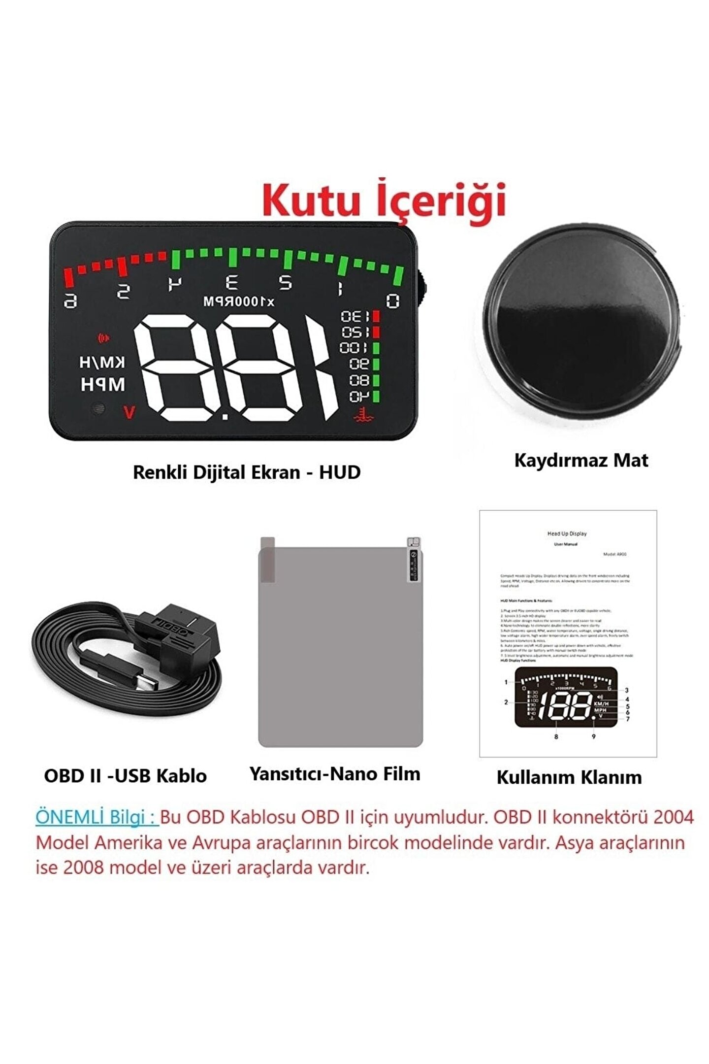Kullanım Talimatı Ürün, OBD girişi olan araçlarda çalışır. Cihazı araca bağladıktan sonra, kontağı açarak ekrandaki değerleri takip edebilirsiniz. Ekranda hararet, hız, devir ve voltaj bilgileri gösterilir. Ürün, araç beyninden (ECU) aldığı verileri yansıtır. Doğru ölçüm için cihazın bağlantısının sağlam olduğundan emin olunuz. Araç üreticisinin bakım ve kullanım talimatlarını dikkate alınız.