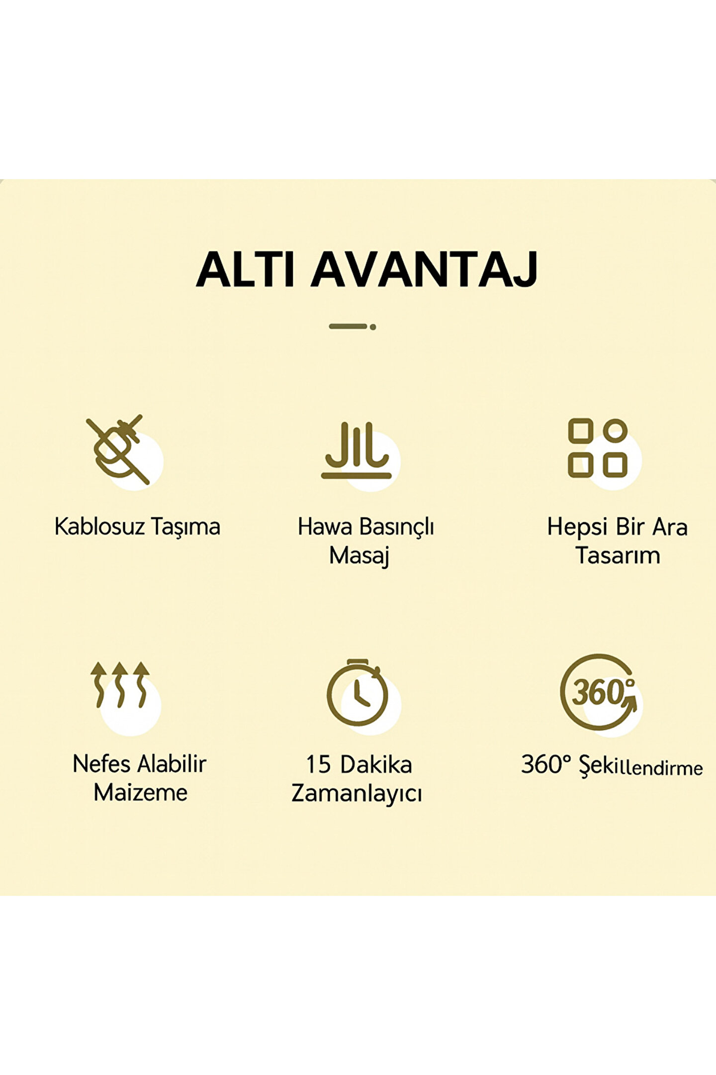 Kablosuz hava yastıklı masaj aleti; bacak, baldır, kol ve ayak bölgesinde kullanılabilir. 3 mod, 3 yoğunluk seviyesi ve 15 dakikalık otomatik kapanma özelliğiyle kas gevşetici rahatlama sağlar.