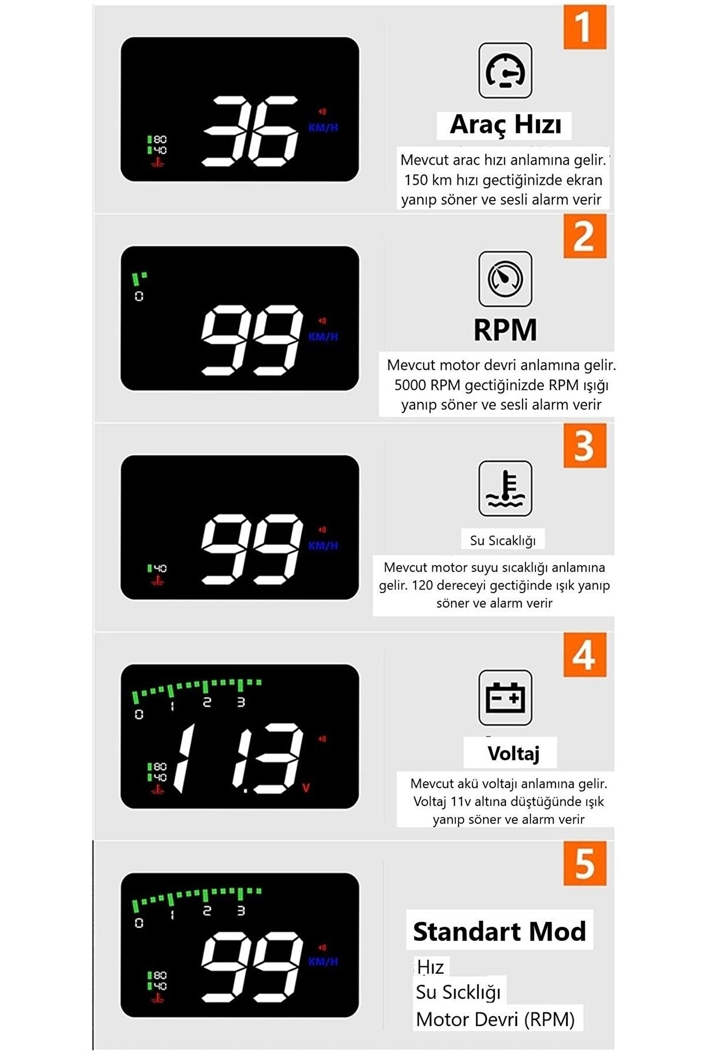 Aşırı hız uyarı sistemi, Hararet Su Sıcaklık Alarmı, Düşük Voltaj-Akü Alarmı HUD Projektör