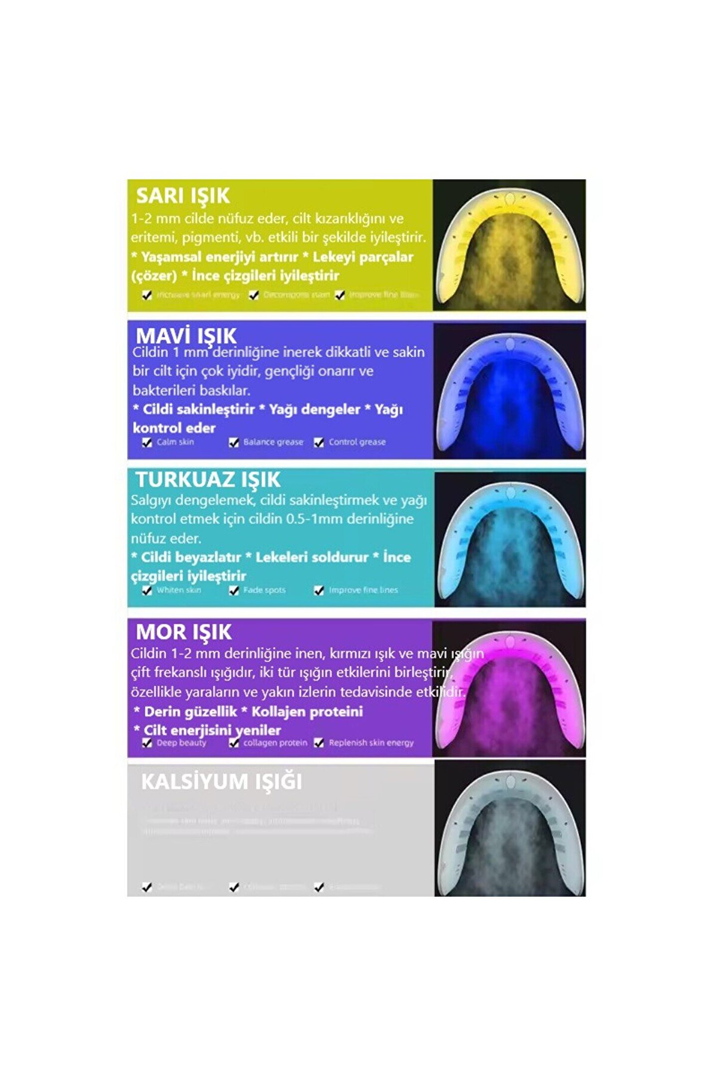 Cihazın özel tasarlanmış LED paneli; mavi, kırmızı, sarı, yeşil, mor ve lazer etkili dalga boylarıyla cildin çeşitli katmanlarına nüfuz ederek doğal iyileşme sürecini destekler. Her bir ışık farklı bir cilt problemine yönelik çalıştığından kullanıcılar kendi ihtiyaçlarına göre uygun dalga boyunu kolayca seçebilir.