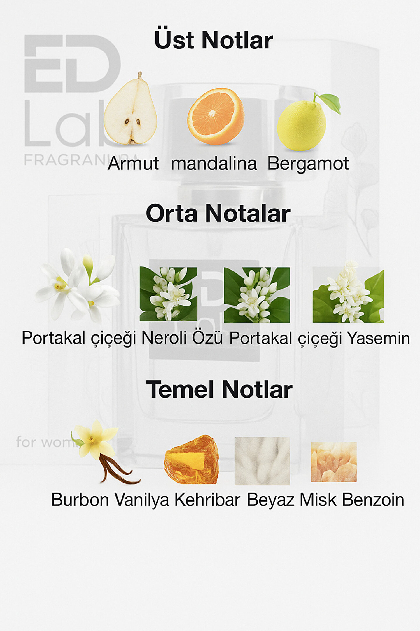Hafif meyveli-narenciye açılışla dikkat çektikten sonra güçlü ve zarif çiçeksel dokusuyla orta bölümde olgunlaşır.; Sonunda ise sıcak amber-vanilya-misk bileşimiyle ciltle bütünleşir.; İlk sıktığınız anda “ne tatlı bir çiçek buketi” hissi verirken; zamanla sizi sıcak bir kucaklama gibi saran bir iz bırakır.; Hem gündüz kullanımları için uygun --hafif parlak, enerjik — hem de akşam.; Özel anlarda havasını değiştirerek daha derin, daha samimi bir aura sunar.
