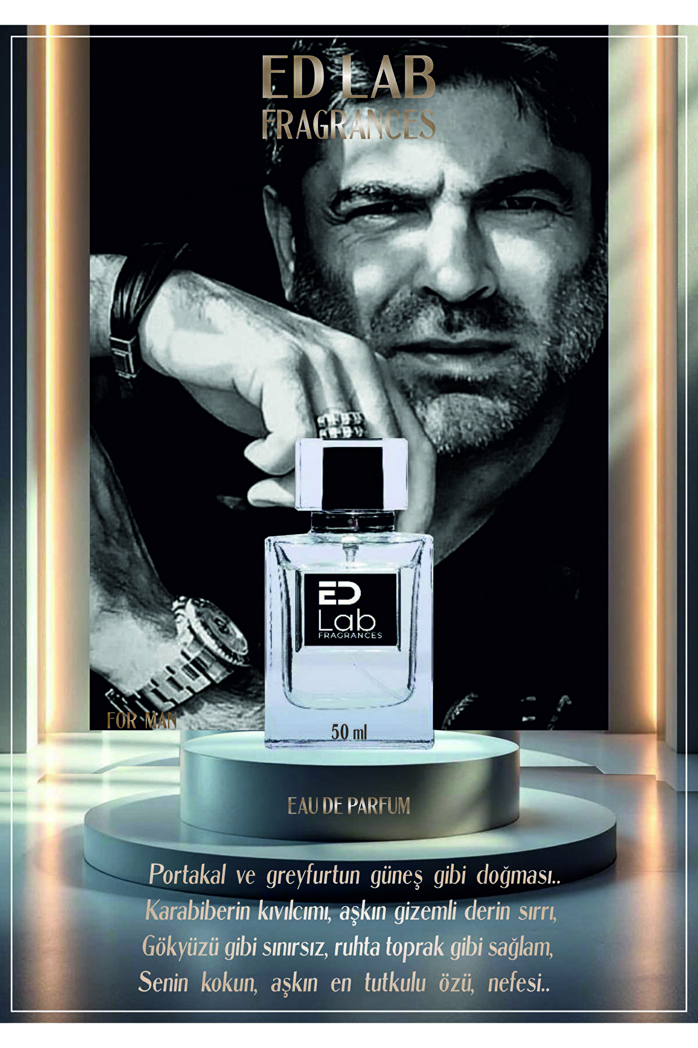 Sade amagüçlü, zamansız şıklıkla hareket eden erkeklere..30 cm uzaktan, enseye, omuz başlarına ve saç uçlarına sıkılması önerilir.