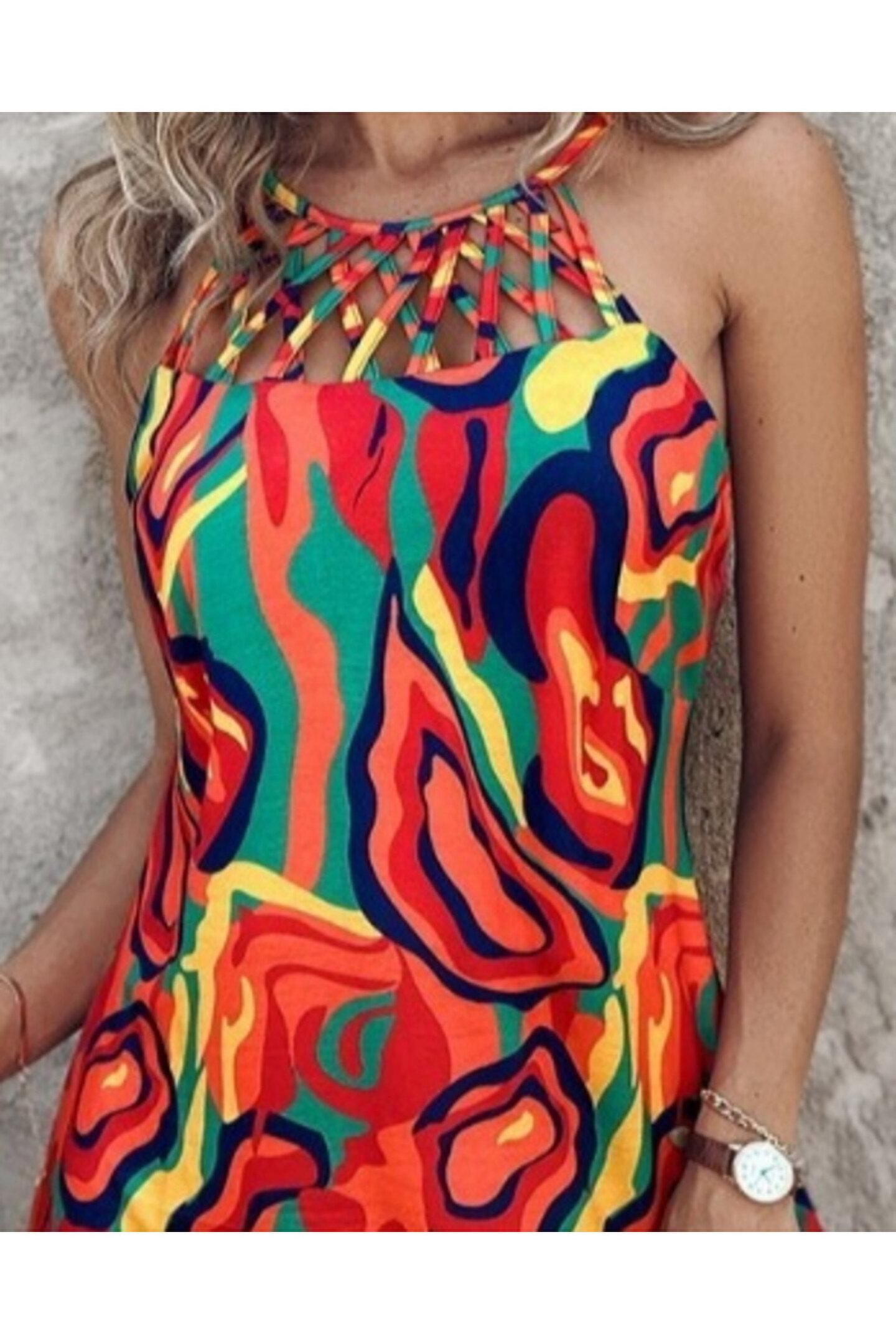 Kadın Omuzlardan Açık çapraz şerit Detaylı Desenli Süprem Elbise
