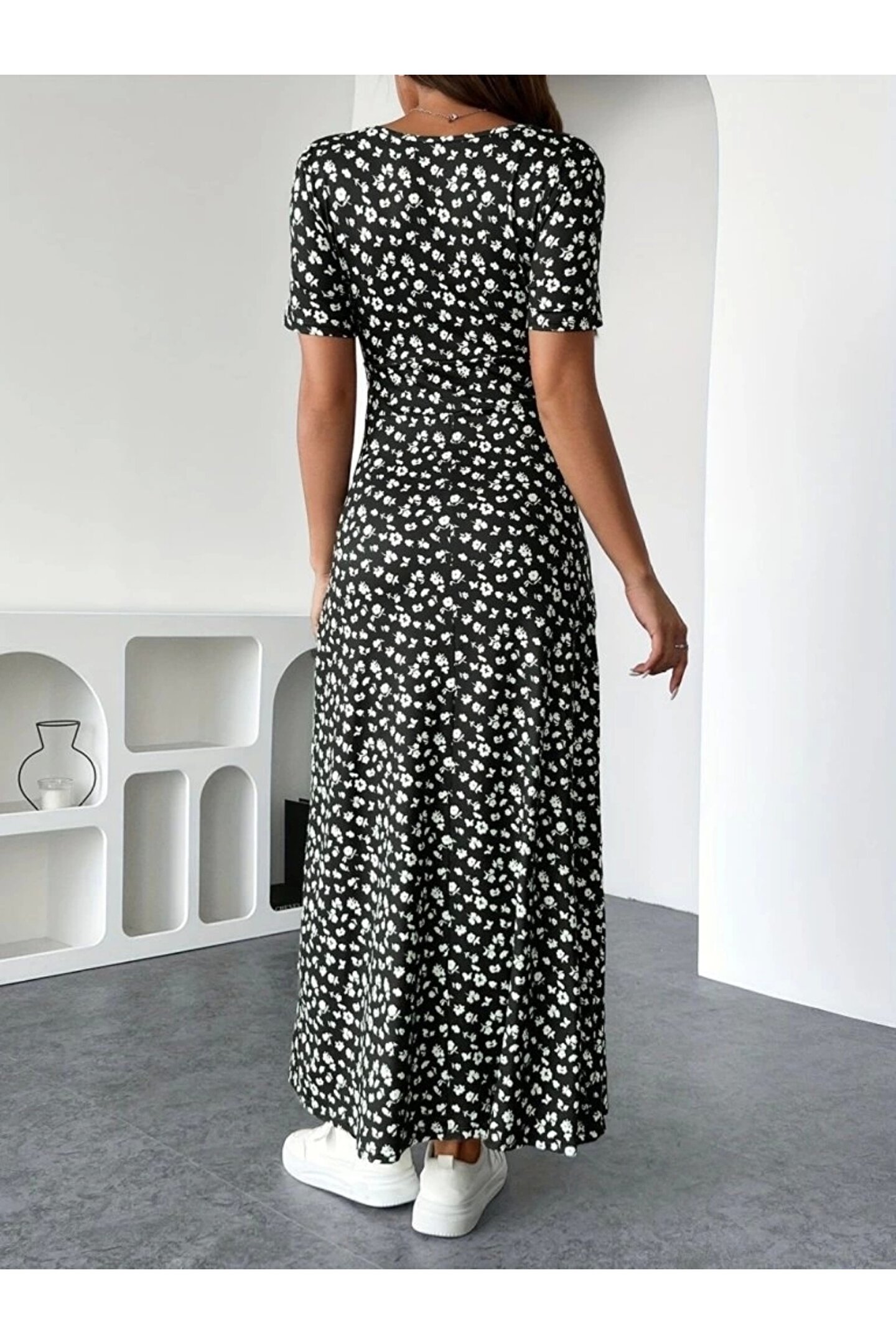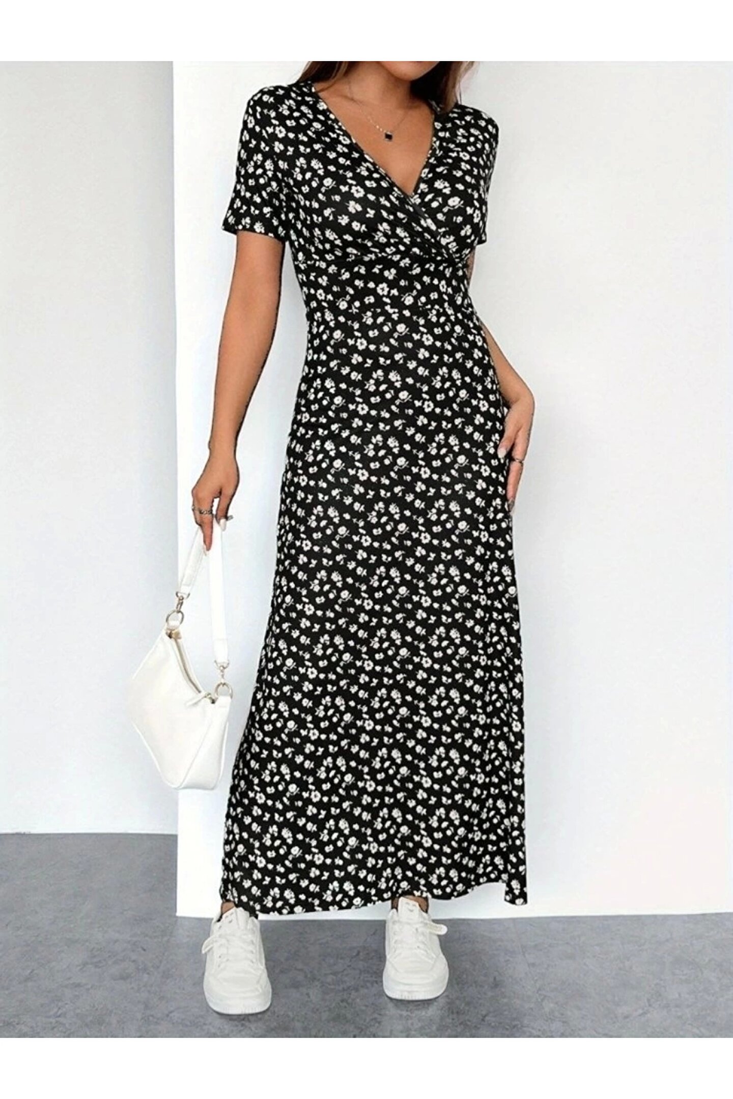 Kadın Kısa Kollu Kruvaze Yakalı çiçek Desenli Süprem Elbise