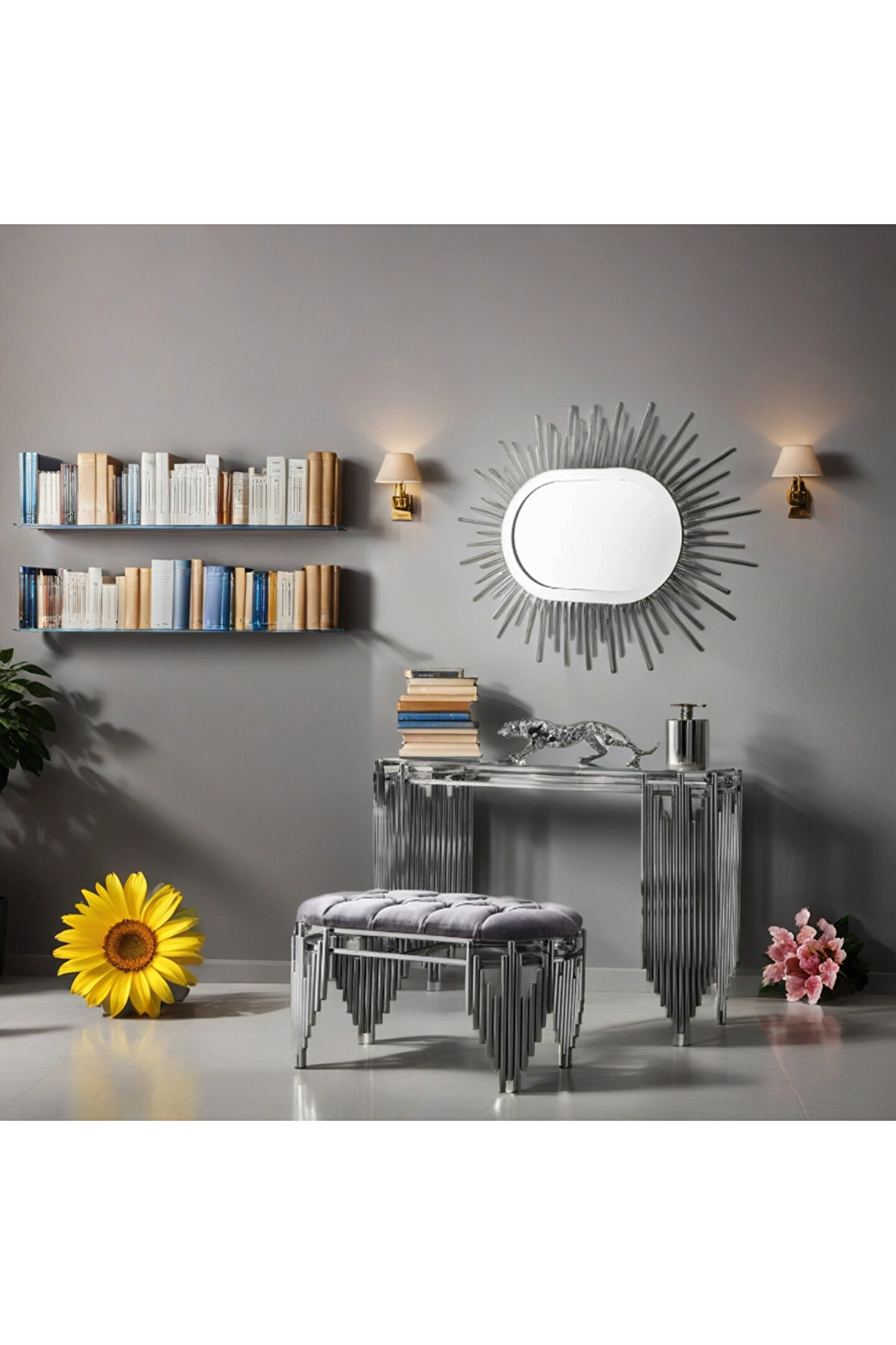 1 yıl garanti süresi ile güvenle kullanım sunar, olası sorunlarda destek alabilirsiniz; Yüksek kaliteli cam materyali sayesinde uzun ömürlü ve dayanıklı bir yapıya sahiptir; Modern tasarımıyla mekanınıza şık ve çağdaş bir hava katar; Aynalı özelliği ile hem dekoratif hem de pratik bir kullanım sağlar, odanızın daha ferah görünmesine yardımcı olur; Gümüş rengi detaylarıyla lüks bir dokunuş ekler ve dekorasyonunuza sofistike bir hava katmak için idealdir;