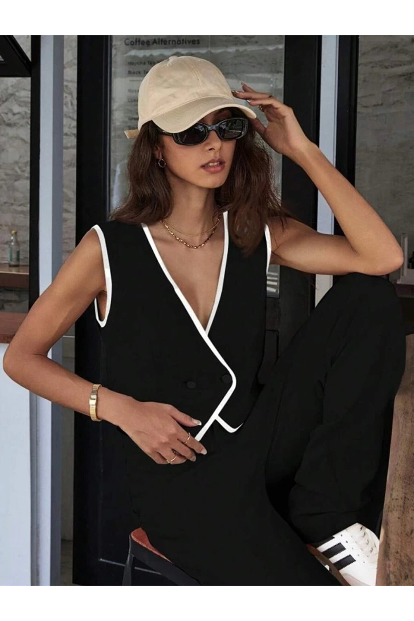 - V yaka tasarımı ile modern ve şık bir görünüm sunar.; - Geniş paça pantolon kesimi, rahat hareket etme özgürlüğü sağlar.; - İki parçadan oluşan takım, kombin yapmayı kolaylaştırır.; - Biyeli detayları ile sofistike bir dokunuş katarken, mono kapama pratik kullanım sunar.; - Baskısız tasarım, sade ve zamansız bir stil oluşturur.; - Astarsız yapısıyla hafif ve konforlu bir deneyim yaşatır.; - Basic koleksiyonun parçası olarak günlük kullanım için idealdir; hem işlevsel hem de estetik.; - Normal bel yüksekliği sayesinde gün boyu rahatlık sağlar.; - Kemersiz tasarımı ile minimalist bir tarz sergiler.; - %96 polyester ve %4 elastan karışımından oluşan materyali esneklik kazandırarak vücut hatlarınıza uyum sağlar.; - Kutusuz paket içeriğiyle ekstra ambalaj atıklarını azaltır.; - Sürdürülebilirlik detayına önem verilmemiştir ancak geri dönüştürülebilir malzemeler kullanılmıştır.; - Düz deseniyle her tür aksesuarla kolayca eşleştirilebilir.; - Krep dokuması sayesinde dayanıklılığı artırırken yumuşak bir hissiyat sunar.; - Esnek yapısıyla vücuda mükemmel otururken kolsuz üst parça yaz ayları için idealdir.; - Casual ortamlarda rahatlıkla tercih edebileceğiniz bu takım, günlük giyimin vazgeçilmezlerindendir.; - Yelekli pantolonlu alt-üst takımıyla tamamlayıcı parçalar arasında yer alır.; - Kolsuz kol tipiyle yaz sıcaklarında ferahlık sağlar.