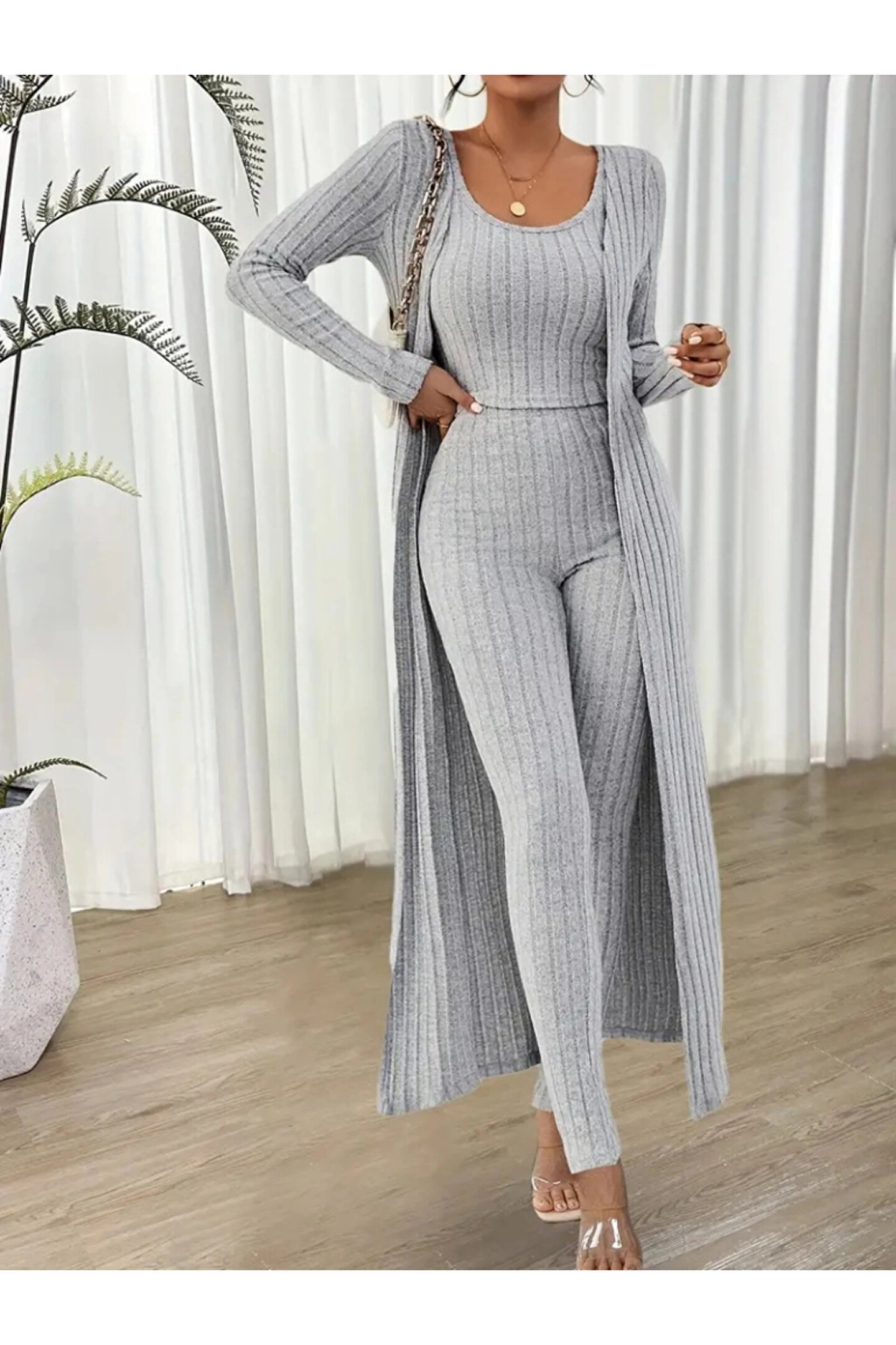 Kadın Yuvarlak Yaka Askılı Krop Bluz Yüksek Bel Tayt Ve Uzun Hırka şardonlu Kaşkorse üçlü Takım
