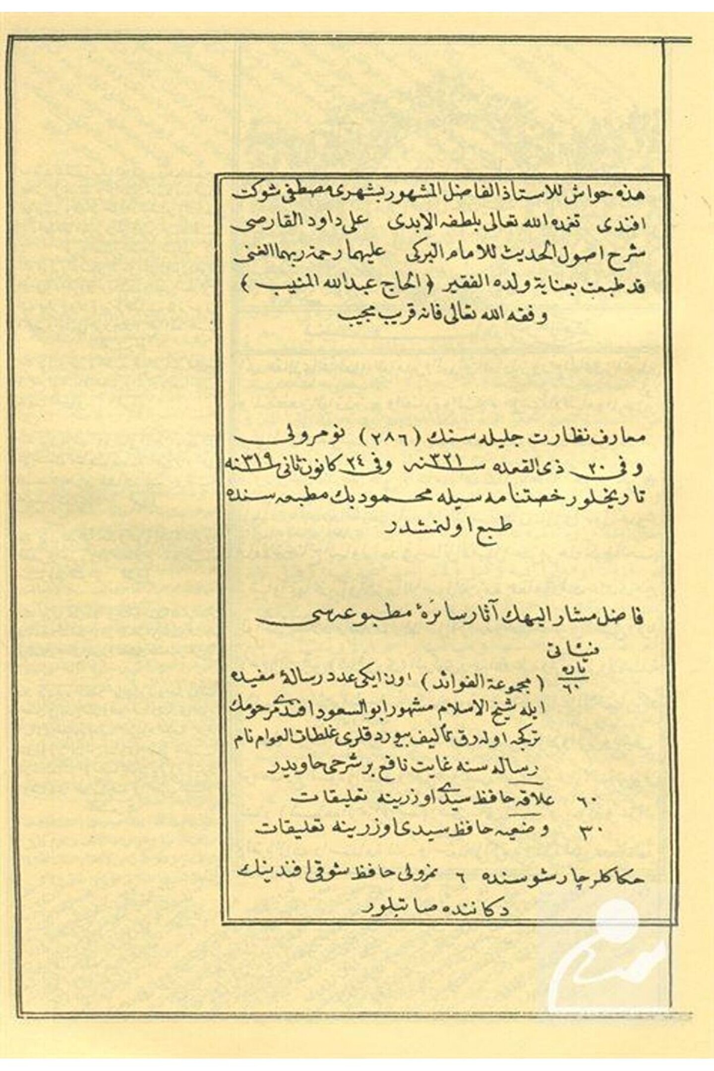 Usulü'l-Hadis Şerhi Dâvûdi Karsî Hadis Usulü (Arapça) Davudi Karsi, İmam Birgivi / El Mektebetül Mahmudiyye Basım Yılı: 2019; Baskı: 1; Sayfa Sayısı: 48; Kağıt Türü: Şamuha Kağıt; Ebat: 16 x 23; Dil: Arapça; Cilt Durumu: Karton Kapak; ISBN: 0000014820; Yazar: Davudi Karsi, İmam Birgivi; Şer?u U?ûli'l-?adîs? li'l-Birgivî. Öğrencilerine ?a?î?-i Bu?ârî okutmadan önce hadis usulüne dair bilgi vermek için Birgivî'nin konuyla ilgili olan Arapça risâlesini şerhetmiştir.