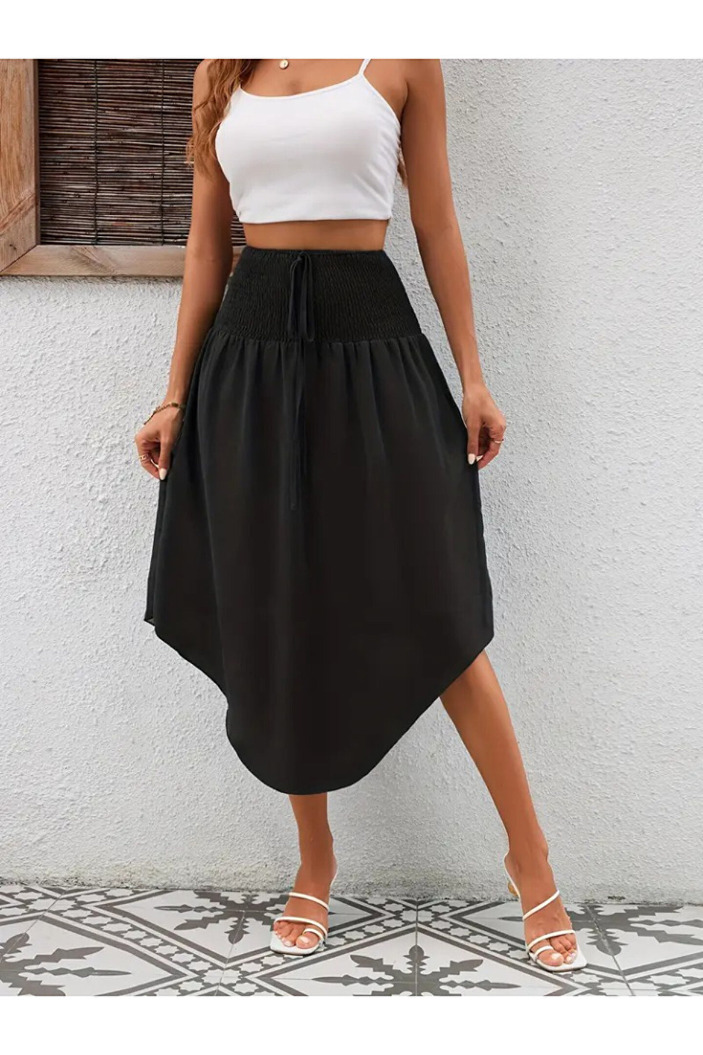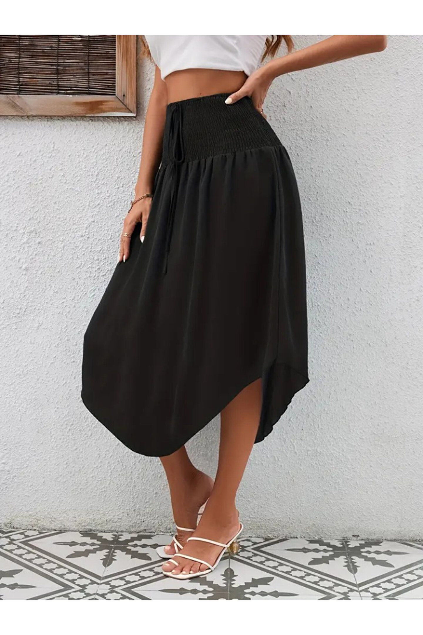 Kadın Yüksek Bel Belden Bağlamalı Asimetrik Kesim Detaylı Sandy Etek