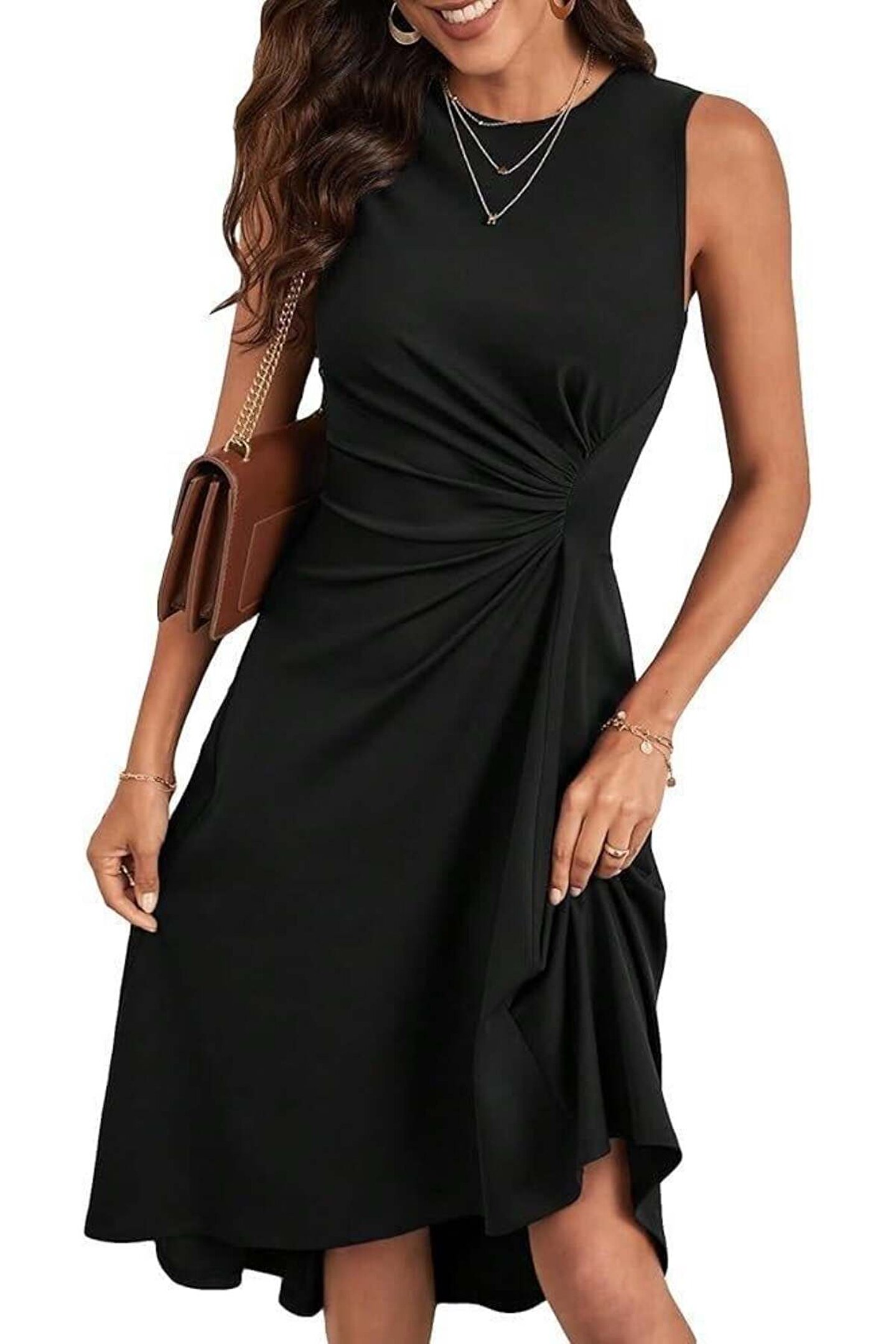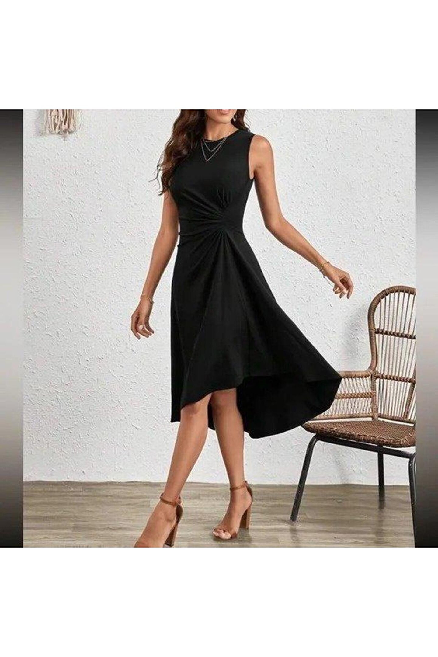 ELEVA FEMME Kadın Sıfır Kollu Bisiklet Yaka Büzgülü Asimetrik Kesim Detaylı Janjan Krep Elbise