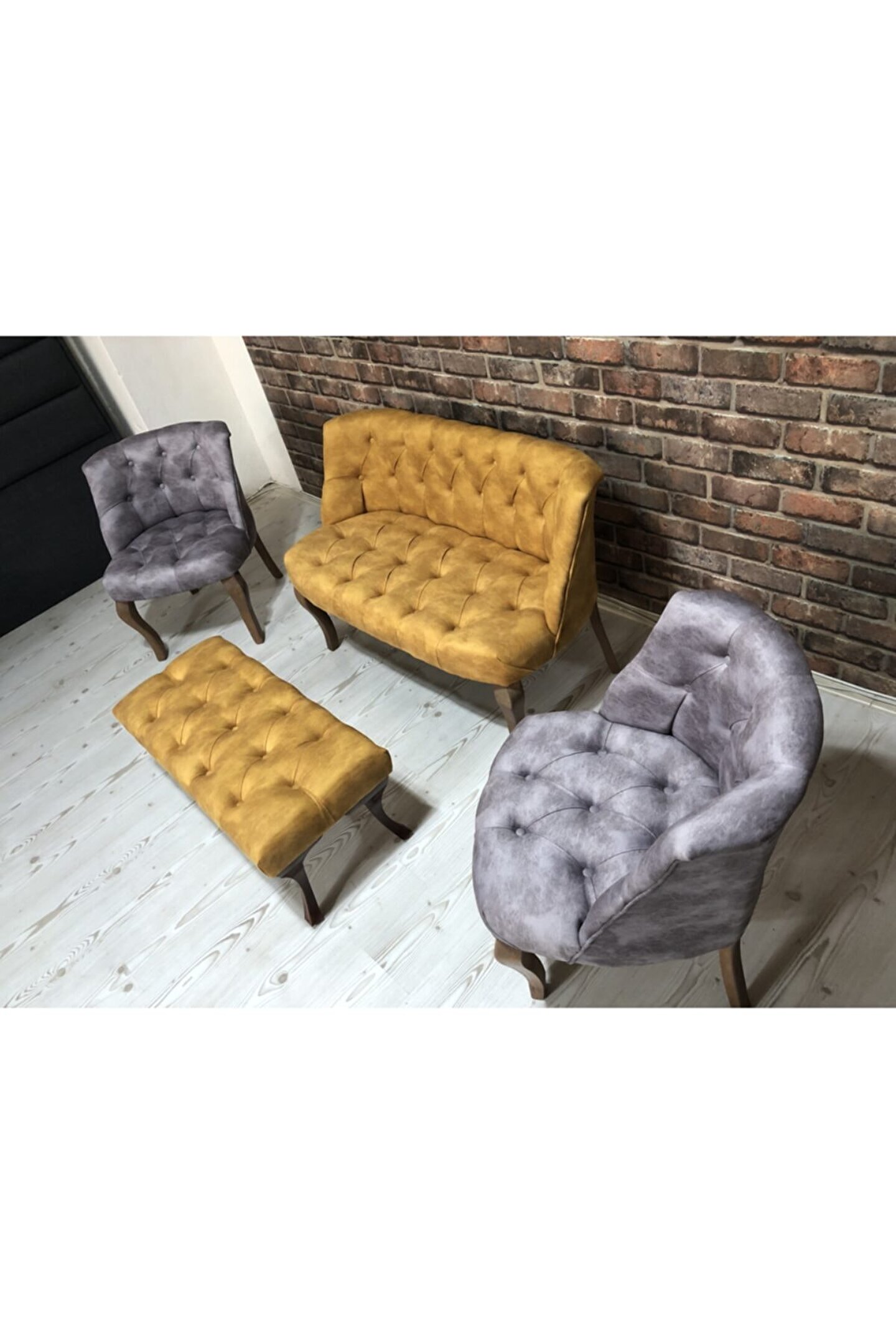 2 adet tek kişilik koltuk, 1 adet çift kişilik koltuk ve 1 adet bench bank ile beraber toplamda 4 parça şeklinde gönderimi yapılmaktadır. ; Sarı ve gri renkli koltuk takımı modelidir. ;