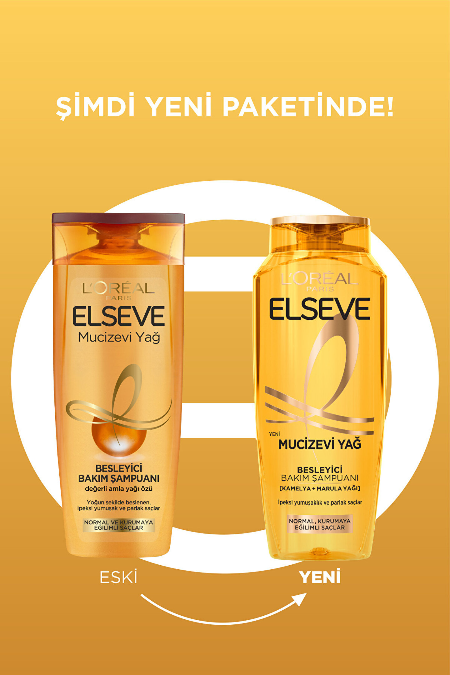 Yeterince beslenmeyen saçlar parlaklığını yitirir, sert ve mat bir görünüm alır.; Elseve Mucizevi Yağ Besleyici Bakım Şampuanı, Kamelya ve Marula Yağı ile zenginleştirilmiş formülüyle; ; 1. +%90 anında beslenme sağlar, 8 haftaya kadar süren besleyici etki içerir.;2. Kuru saçları yoğun şekilde nemlendirir.; 3. Göz alıcı parlaklık sağlar.;4. İpeksi yumuşaklık verir ve canlı görünüm kazandırır.
