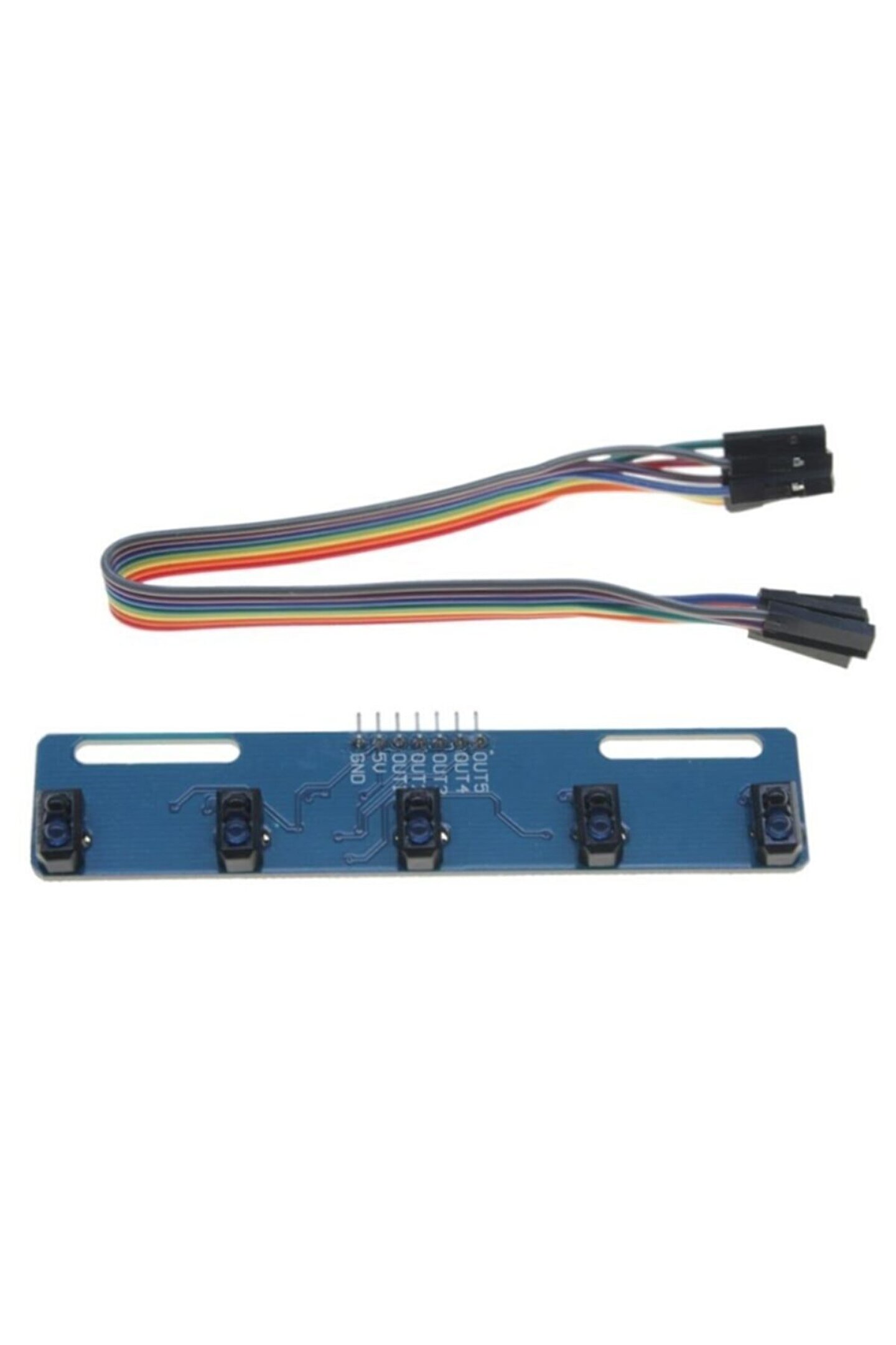 Teknik Özellikler: 1. ; Tip: 5-li Çizgi İzleme Sensörü 2. ; Boyut: 95mm x 20mm (LxW) 3. ; çip kullanın: 74HC14D 4. ; çalışma gerilimi: 3.3v-5v 5. ; Çıkış modu: dijital sinyal 6. ; Ölçüm mesafesi: 1CM-1.5CM 7. ; Algılama sondası: TCRT5000L 8. ; Algılama sinyali: siyah çizgi girişi düşük algılama, beyaz algılama 9. ; doğruluk, algılama aralığı çıkışı düşük seviyesinin ötesindedir. ; 10. ; LED durumu: siyah çizginin algılanması LED kapalı, beyaz çizgi LED ışığının algılanması Bağlantılar: 1.VCC: VCC, 3.3V ~ 5V voltajına erişebilen güç giriş portudur 2.GND: GND, güç kaynağının negatif girdisidir 3.OUT1 ~ 5: OUT, sinyal çıkış portu, MCU link I / O portudur.;