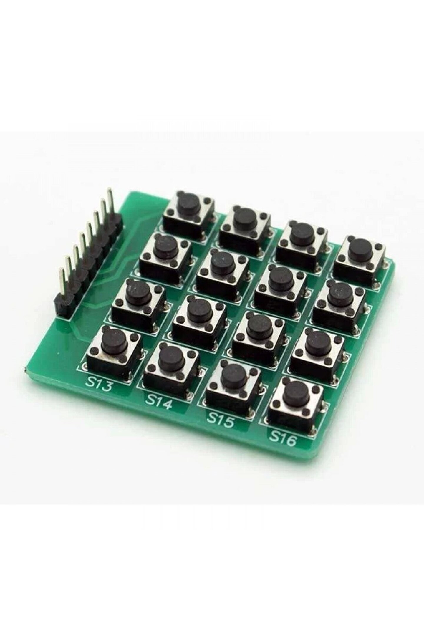 Ürün Adı: Arduino Keypad 4x4 Matrix 16 Button Switch Tuş Takımı Ürün Açıklaması: Arduino Keypad 4x4 Matrix 16 Button Switch Tuş Takımı, Arduino ve diğer mikrodenetleyiciler ile birlikte kullanılan, kullanıcı girişi için tasarlanmış bir modüldür. 16 adet butondan oluşan 4x4 matris dizilimindedir. Ürün Özellikleri: 4x4 matris konfigürasyonu: Bu düzenleme, 16 adet butonun kompakt bir alanda yerleştirilmesine olanak tanır, bu da alan sınırlı olduğunda idealdir.; Dokunsal tuşlar: Tuşlar basıldığında tatmin edici bir tıklama sesi çıkarır, bu da kullanıcı dostu ve duyarlı hale getirir.; Pull-up dirençler: Her bir düğme sırası ve sütunu yerleşik bir pull-up dirençine sahiptir, bu da elektriksel gürültü nedeniyle yanlış düğme basmalarını önlemeye yardımcı olur.; Kolay bağlantı: Düğme takımı, Arduino kartı veya diğer mikrodenetleyicilere jumper kablolar kullanılarak kolayca bağlanabilen erkek başlık pinleri ile birlikte gelir.; Yazılım kitaplıkları mevcuttur: Arduino için hazır bulunan yazılım kitaplıkları, düğme takımını okumayı ve düğme basmalarını yorumlamayı basitleştirir.; Ürün Uygulamaları: Etkileşimli projeler için kullanıcı girişi: Projenizin çeşitli yönlerini kontrol etmek için düğmeyi kullanabilirsiniz, örneğin sesler çalmak, LED renklerini değiştirmek veya farklı eylemleri tetiklemek.; Veri girişi: Düğmeyi, projenize sayılar, harfler veya başka veriler girmek için kullanabilirsiniz.; Oyun kontrolörleri: Düğmeyi, oyun kontrolörleri oluşturmak için düğmeler ve diğer girdiler için kullanabilirsiniz.; Menü gezintisi: Düğmeyi, projenizdeki menülerde ve seçimlerde gezinmek için kullanabilirsiniz.; Ürün Avantajları: Kompakt ve kullanışlı boyut; Dokunsal tuşlar; Pull-up dirençler; Kolay bağlantı; Mevcut yazılım kitaplıkları; Sonuç: Arduino Keypad 4x4 Matrix 16 Button Switch Tuş Takımı, Arduino projenize çeşitli kullanıcı giriş seçenekleri ekleyebilen çok yönlü ve kullanımı kolay bir modüldür.