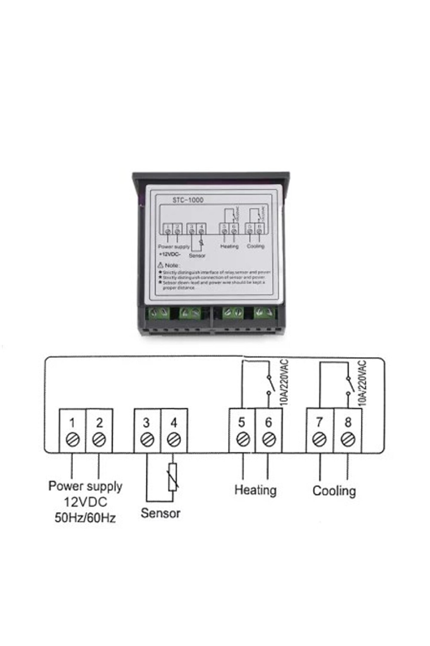 ⚠️ Önemli Kurulum Notu: Cihazın beslemesi 12V DC ile yapılır. Ancak ısıtma ve soğutma röle çıkışları "kuru kontak" (anahtar) mantığıyla çalışır. Yani fanı veya ısıtıcıyı çalıştırmak için röle girişine ayrıca güç vermeniz gerekir (Şemada gösterildiği gibi). Röleler voltaj üretmez, devreyi tamamlar.