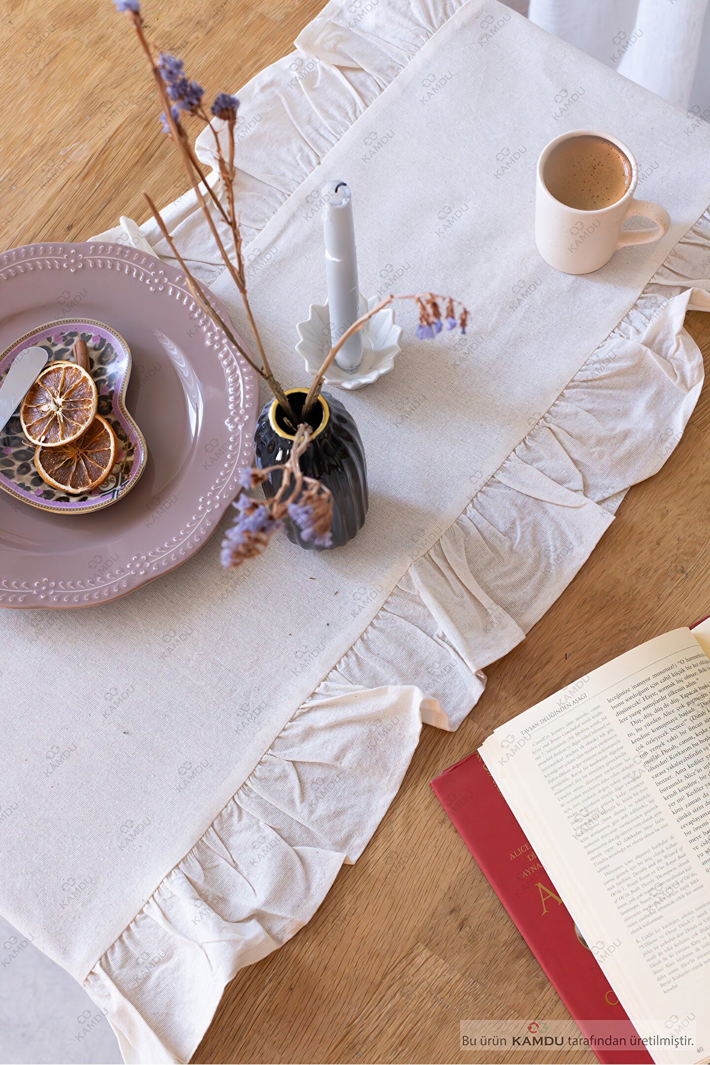 - %100 keten pamuktan üretilmiş, dayanıklı ve uzun ömürlü kullanım sunar.; - Vintage fırfırlı tasarımı ile mekanınıza nostaljik bir hava katar.; - 30 derecede yıkanabilir olması sayesinde kolayca temizlenebilir ve bakımı pratiktir.; - Dikdörtgen formu ile çeşitli masa boyutlarına uyum sağlar ve şık bir görünüm oluşturur.; - 40 x 125 cm ölçülerindeki geniş yüzey alanı, yemek masanızda rahatça kullanılabilirlik sunar.