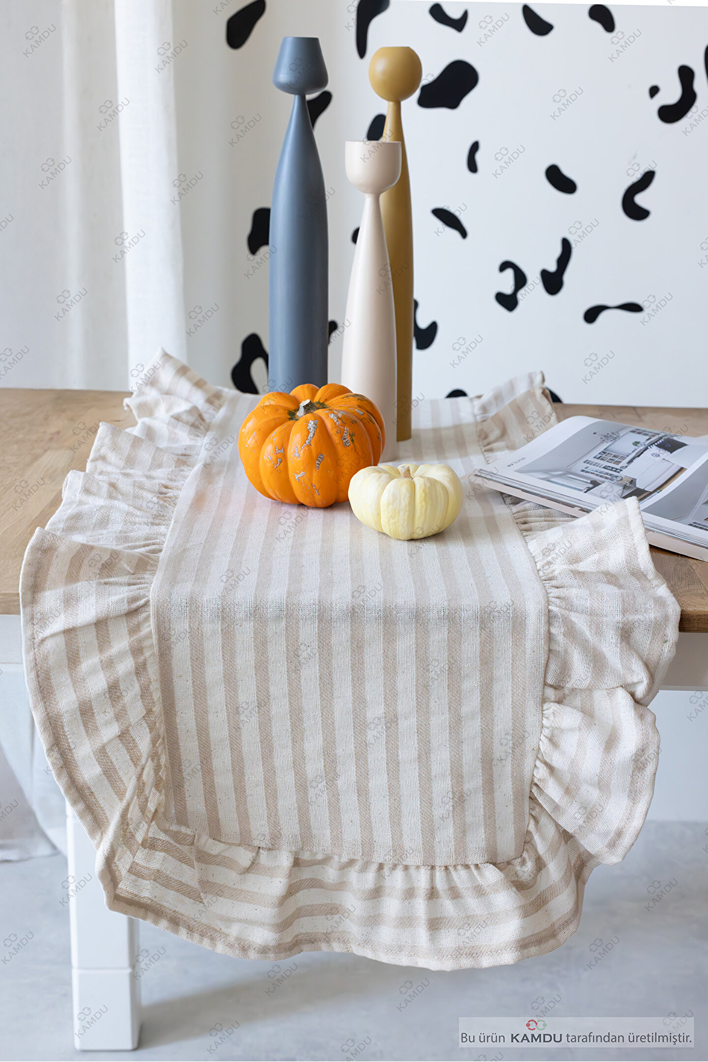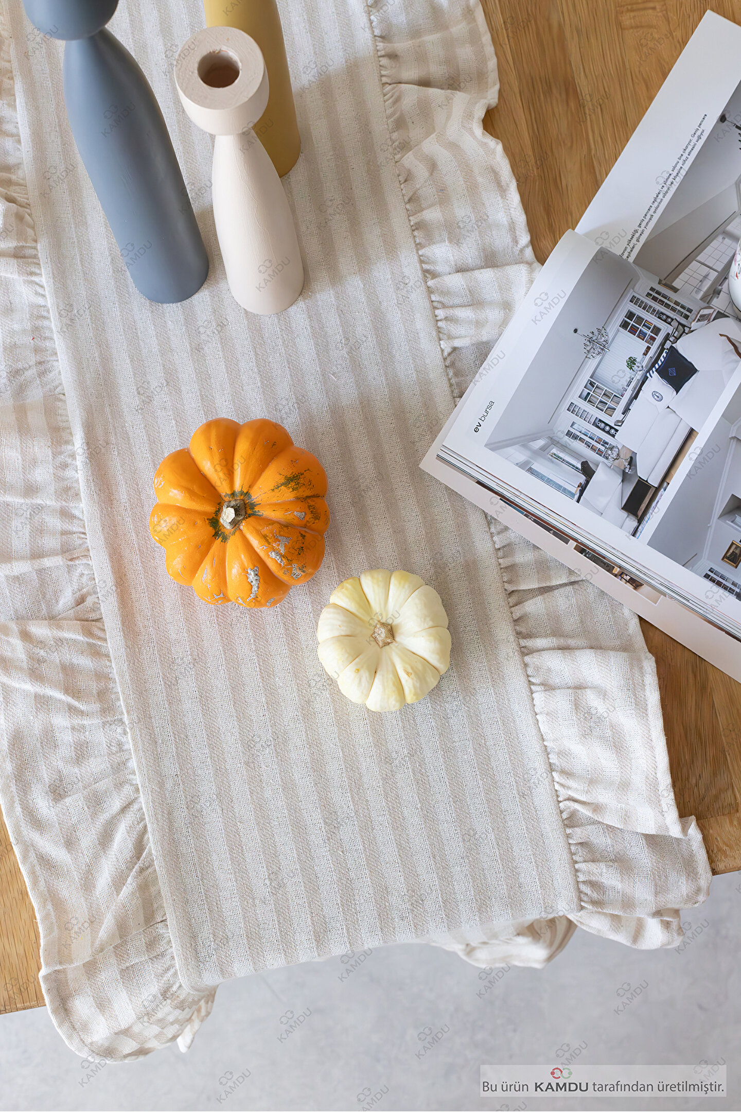 - %100 keten pamuktan üretilmiş, dayanıklı ve uzun ömürlü kullanım sunar.; - Vintage fırfırlı tasarımı ile mekanınıza nostaljik bir hava katar.; - 30 derecede yıkanabilir olması sayesinde kolayca temizlenebilir ve bakımı pratiktir.; - Dikdörtgen formu ile çeşitli masa boyutlarına uyum sağlar ve şık bir görünüm oluşturur.; - 40 x 125 cm ölçülerindeki geniş yüzey alanı, yemek masanızda rahatça kullanılabilirlik sunar.