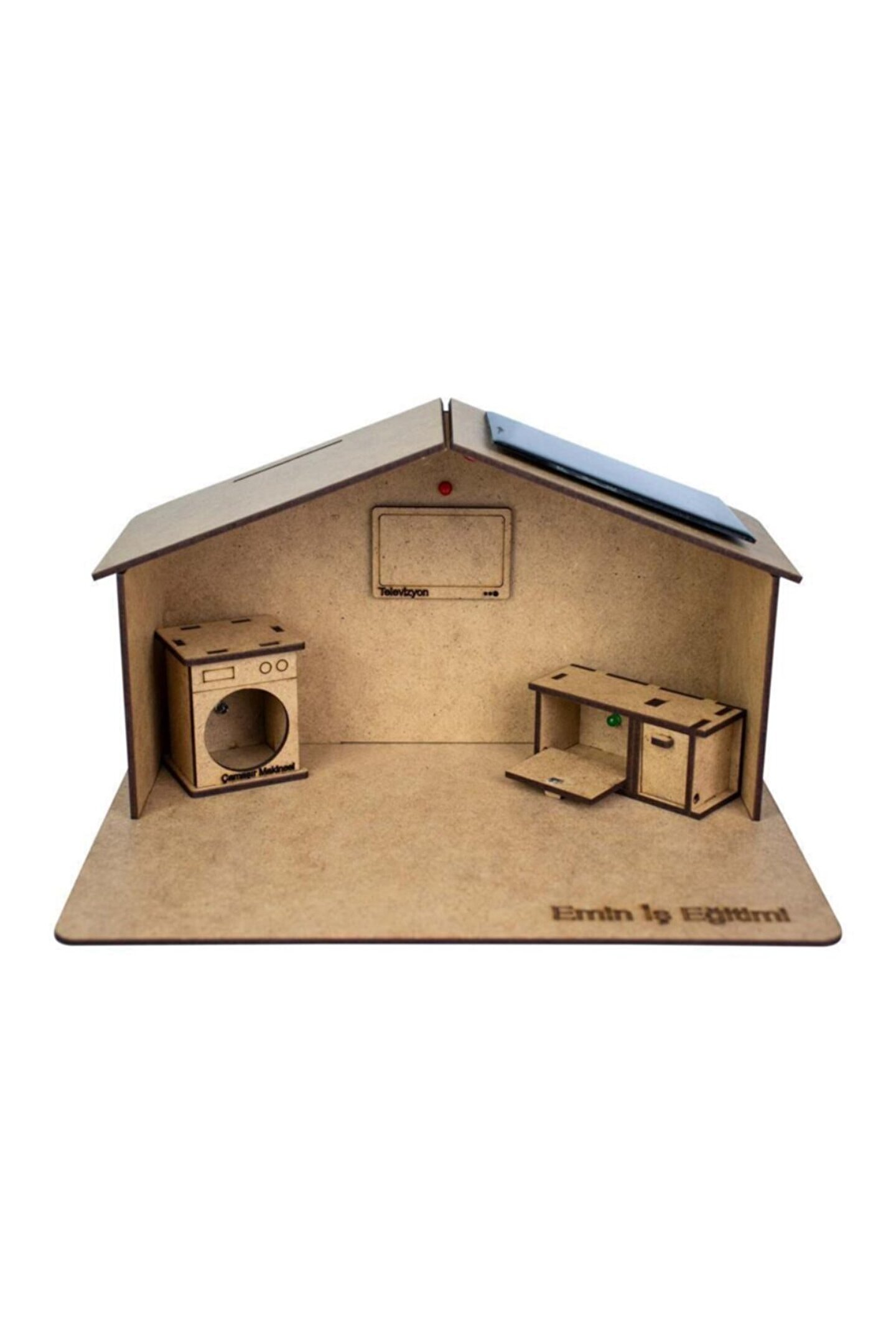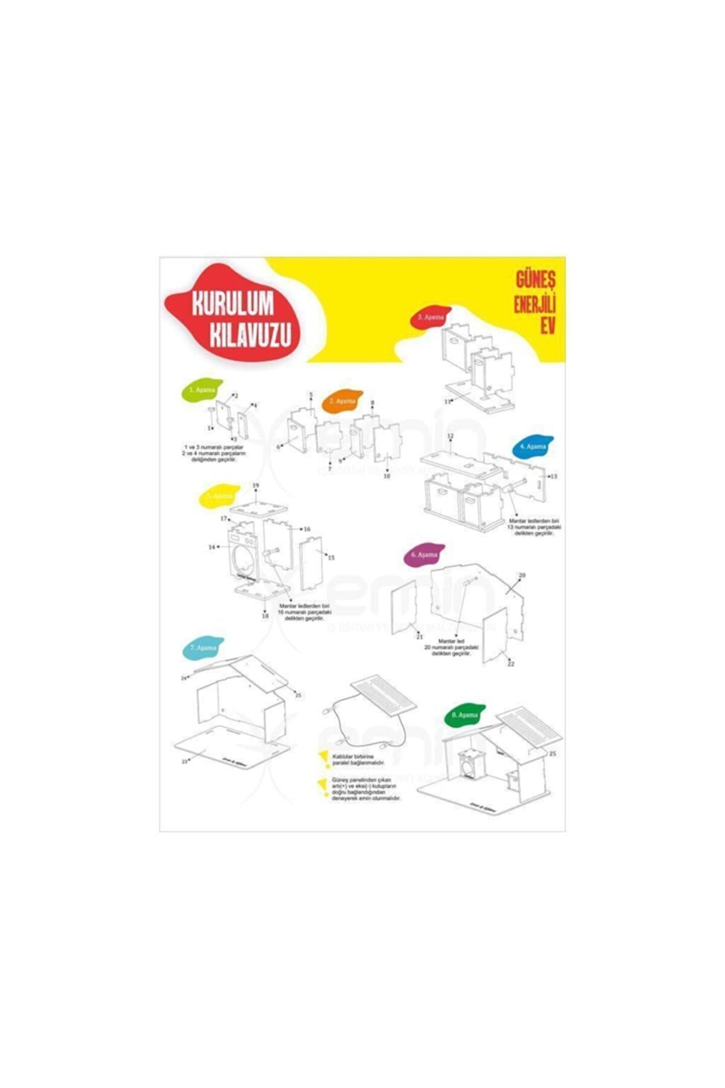 Güneş Enerjili Ev Yapımı Solar Eğitim Seti Güneş Enerjili Ev Yapımı Solar Eğitim Seti, çocuklarınıza eğitici bir deneyim sunan ve aynı zamanda eğlenceli vakit geçirmelerini sağlayan muhteşem bir oyuncak setidir. Bu set, çocuklarınızın hem güneş enerjisinin gücünü öğrenmelerini hem de yenilenebilir enerji kaynaklarından olan güneş enerjisini anlamalarına yardımcı olacak. Ürün Özellikleri: Güneş Enerjili Ledler: Güneş enerjisiyle çalışan ledler, çocuklarınızın ışıkları yakmak için güneş ışığının gücünü kullanmalarını sağlar. Hem çevre dostu hem de eğitici bir deneyim sunar.; Güneş Paneli: Güneş paneli, arabayı güneş ışığı altında çalıştırmak için kullanılır. Çocuklarınız, güneş enerjisi teknolojisini uygulamalı olarak deneyimler..; Eğitici Deneyim: Çocuklarınız, güneş enerjisi, elektrik devreleri ve kumanda teknolojisi hakkında temel bilgileri eğlenerek öğrenirler.; Ürün İçeriği: Güneş Paneli; Kırmızı Led; Yeşil Led; Beyaz Led; 2 adet Bağlantı Kablosu; 23 adet 3mm MDF; Kurulum Kılavuzu; Neden \"Güneş Enerjili Ev Seti\"? Eğitici ve eğlenceli: Çocuklarınıza güneş enerjisi konusunda pratik bilgi kazandırırken eğlenceli vakit geçirmelerini sağlar.; Çevre dostu: Güneş enerjisi kullanarak çocuklarınızın çevre bilincini artırır.; Yaratıcılığı teşvik eder: ev tasarımı sırasında çocuklarınızın yaratıcılıklarını geliştirir.; Öğrenme fırsatı: Temel fizik ve teknoloji prensiplerini eğlenceli bir şekilde öğrenmelerine yardımcı olur.; \"Güneş Enerjili ev Seti,\" çocuklarınıza hem eğitici hem de eğlenceli bir deneyim sunar. Şimdi bu harika ürünü sipariş vererek çocuklarınızın eğlenirken öğrenmelerine destek olun.