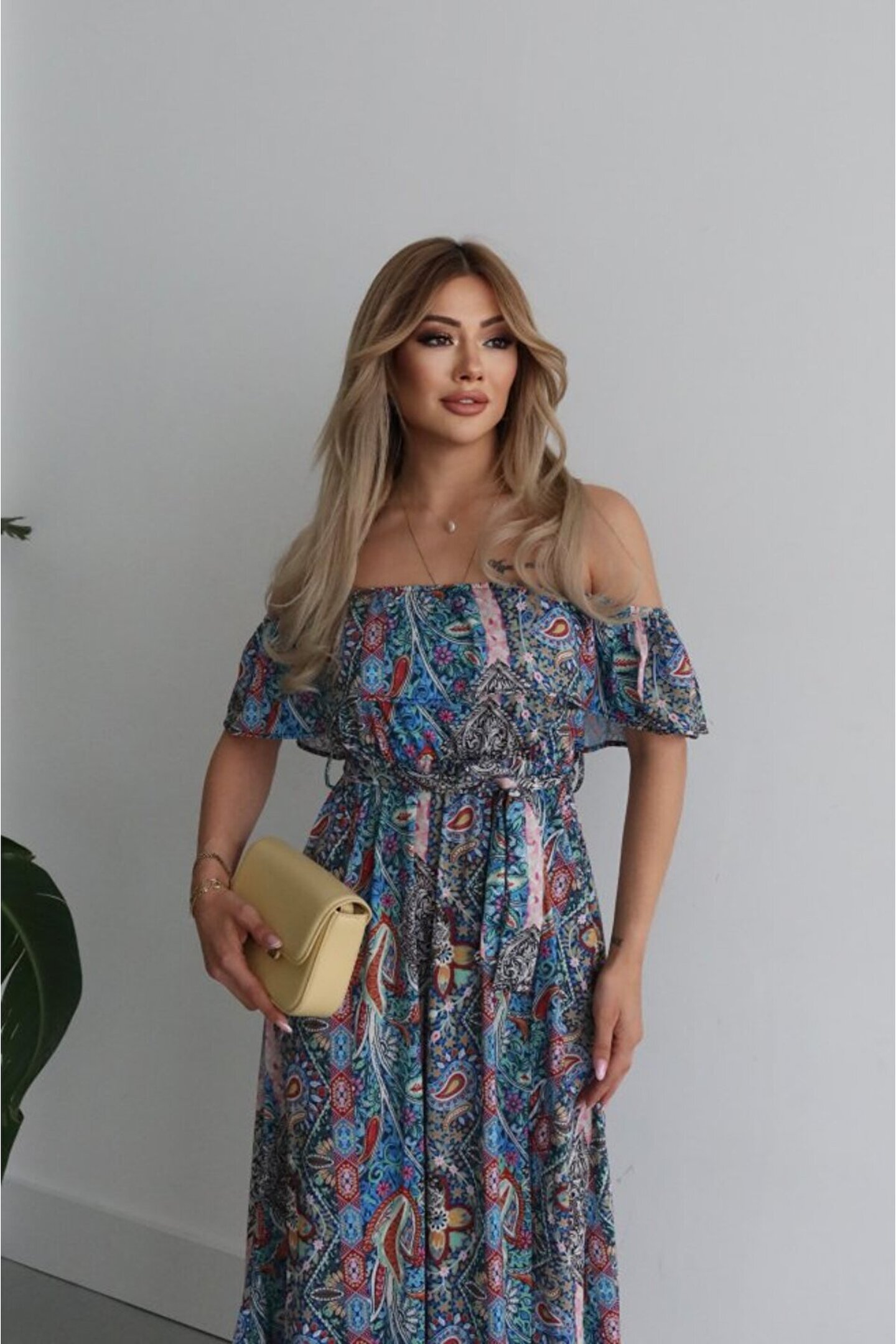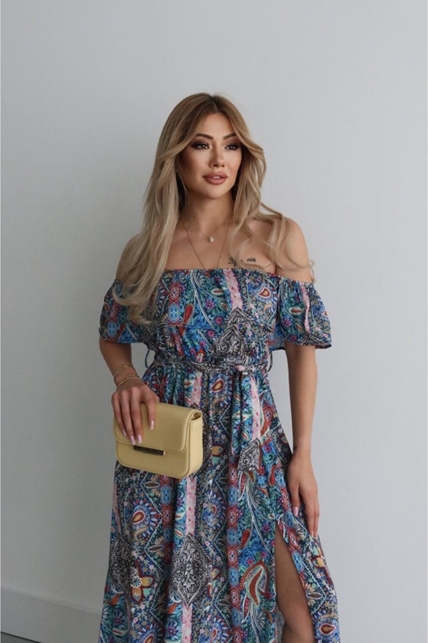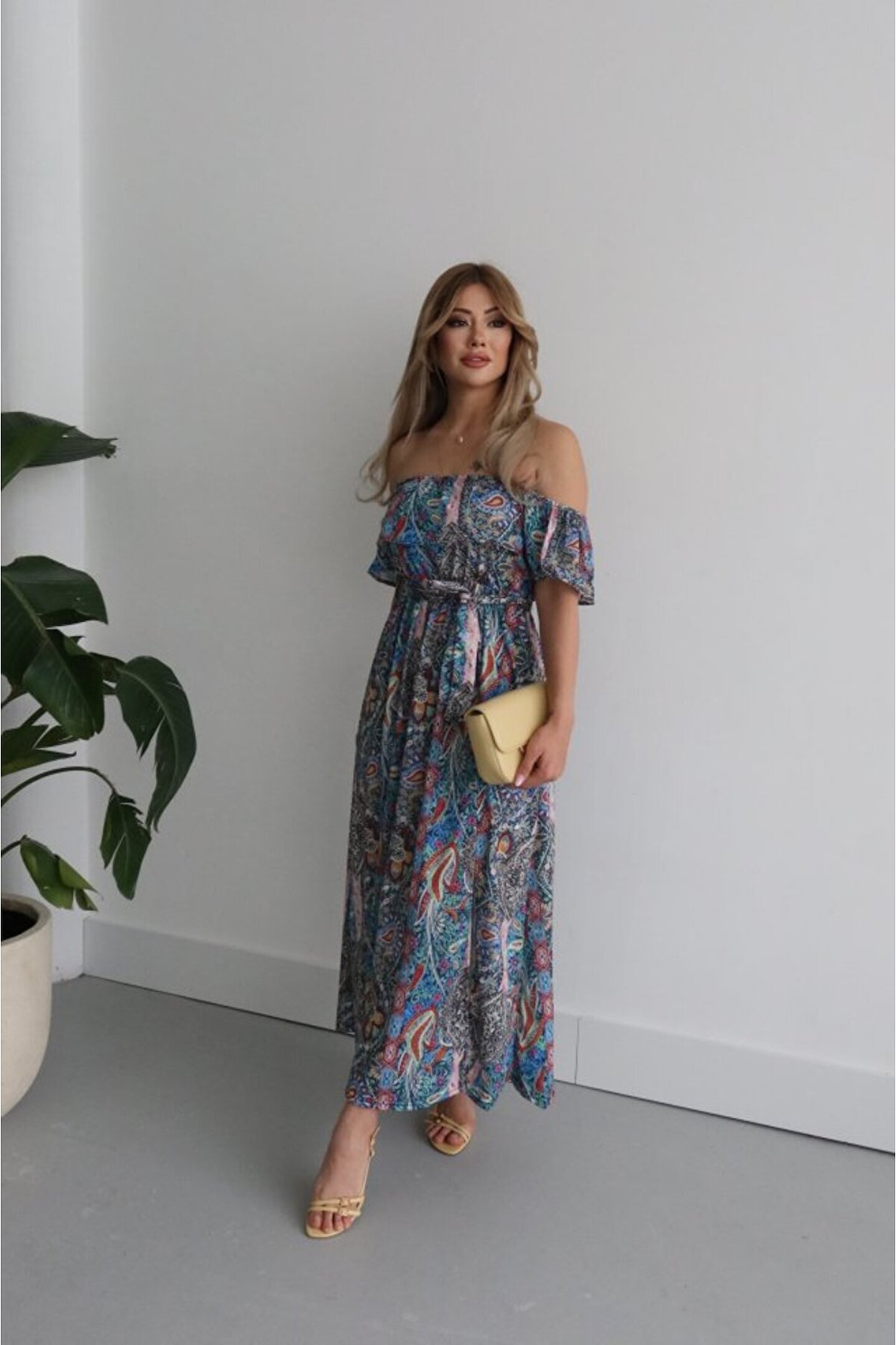 Emiray Store MODAVERA Kadın Kısa Kollu Madonna Yaka Fırfırlı Belden Yırtmaçlı Maksi Süprem Elbise