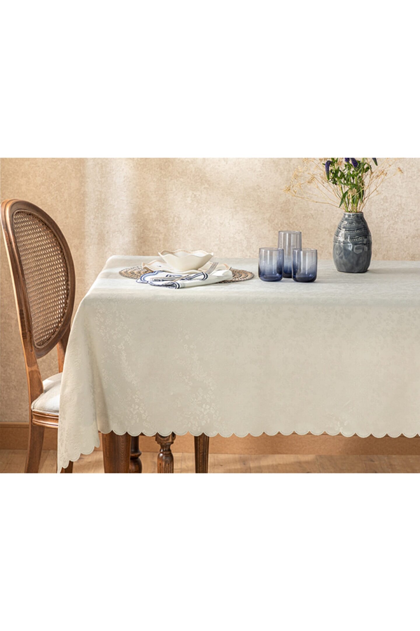 Polyester kumaştan üretilmiş olup, dayanıklılığı ve kolay temizlenebilir yapısıyla öne çıkar; 150x200 cm boyutlarındaki dikdörtgen şekli, geniş masa yüzeyleri için ideal bir örtü seçeneği sunar; Type 3 yıkama talimatına uygun şekilde kolayca temizlenebilir; böylece hijyenik bir kullanım sağlar;