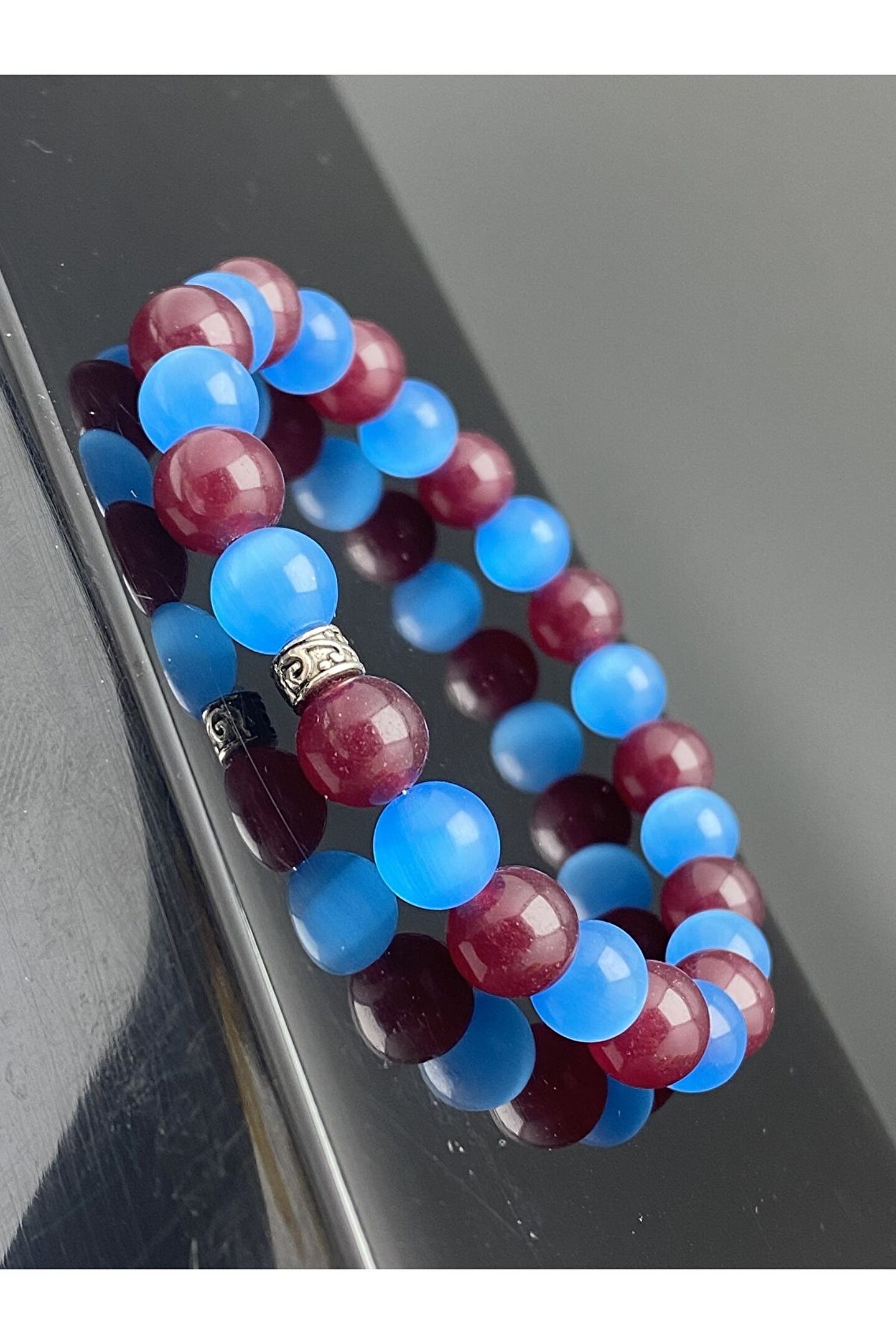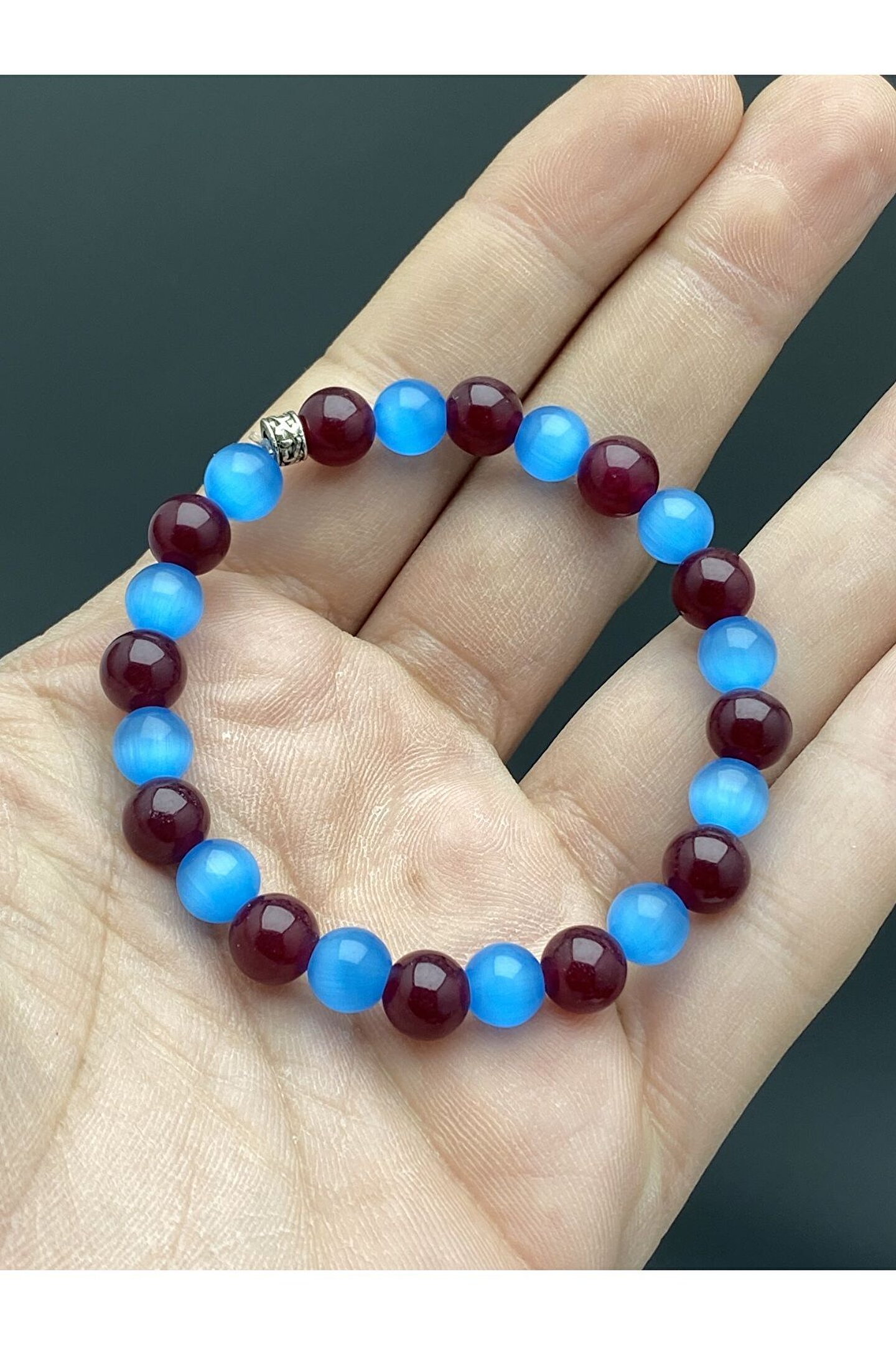 Trabzonlu taraftarlara özel tasarımıyla dikkat çeken bu bileklik, mavi kedi gözü ve akik taşlarıyla süslenmiştir; Doğal taş kullanımı sayesinde her bileklik benzersiz ve otantik bir görünüm sunar; Hem şıklığı hem de doğallığı bir arada sunan bu aksesuar, günlük kullanım için idealdir; Mavi kedi gözü ve akik taşının eşsiz kombinasyonu, bilekliğe mistik bir hava katarken, Trabzonlu taraftarların ruhunu yansıtır;