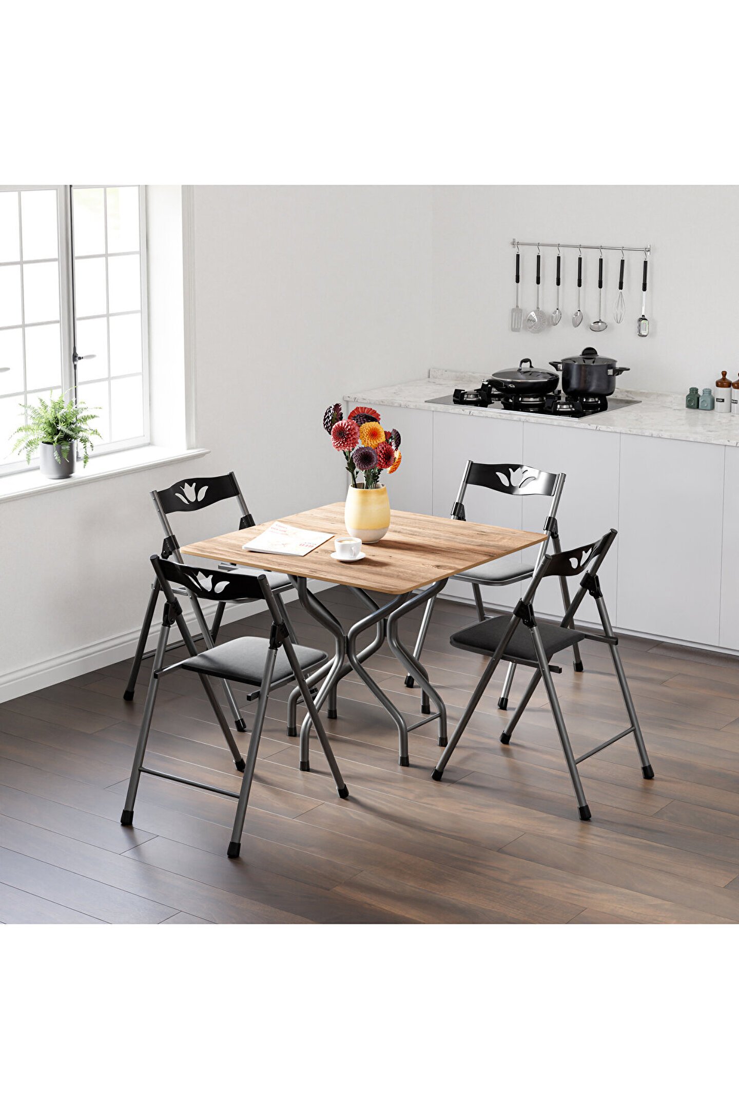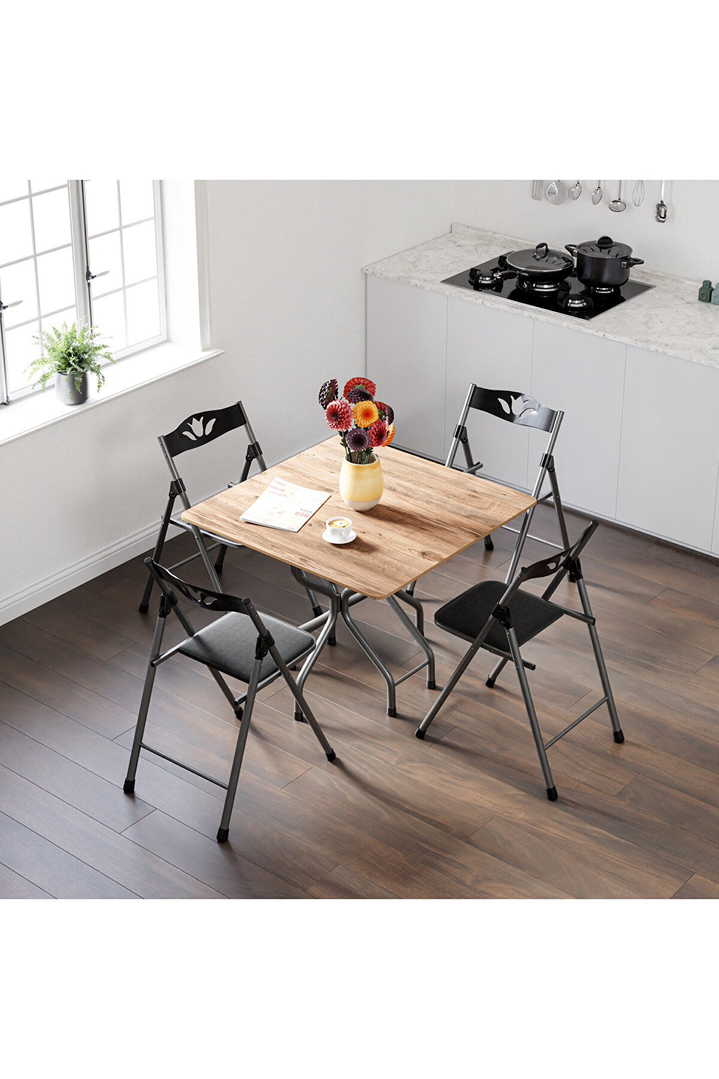 Sabit masa fonksiyonu, stabil ve güvenilir bir kullanım sağlar; - Sandalyelerde kullanılan deri kumaş, şık ve dayanıklı bir görünüm kazandırır; - Siyah renk seçeneği ile modern ve zarif bir dekorasyon stili oluşturur;
