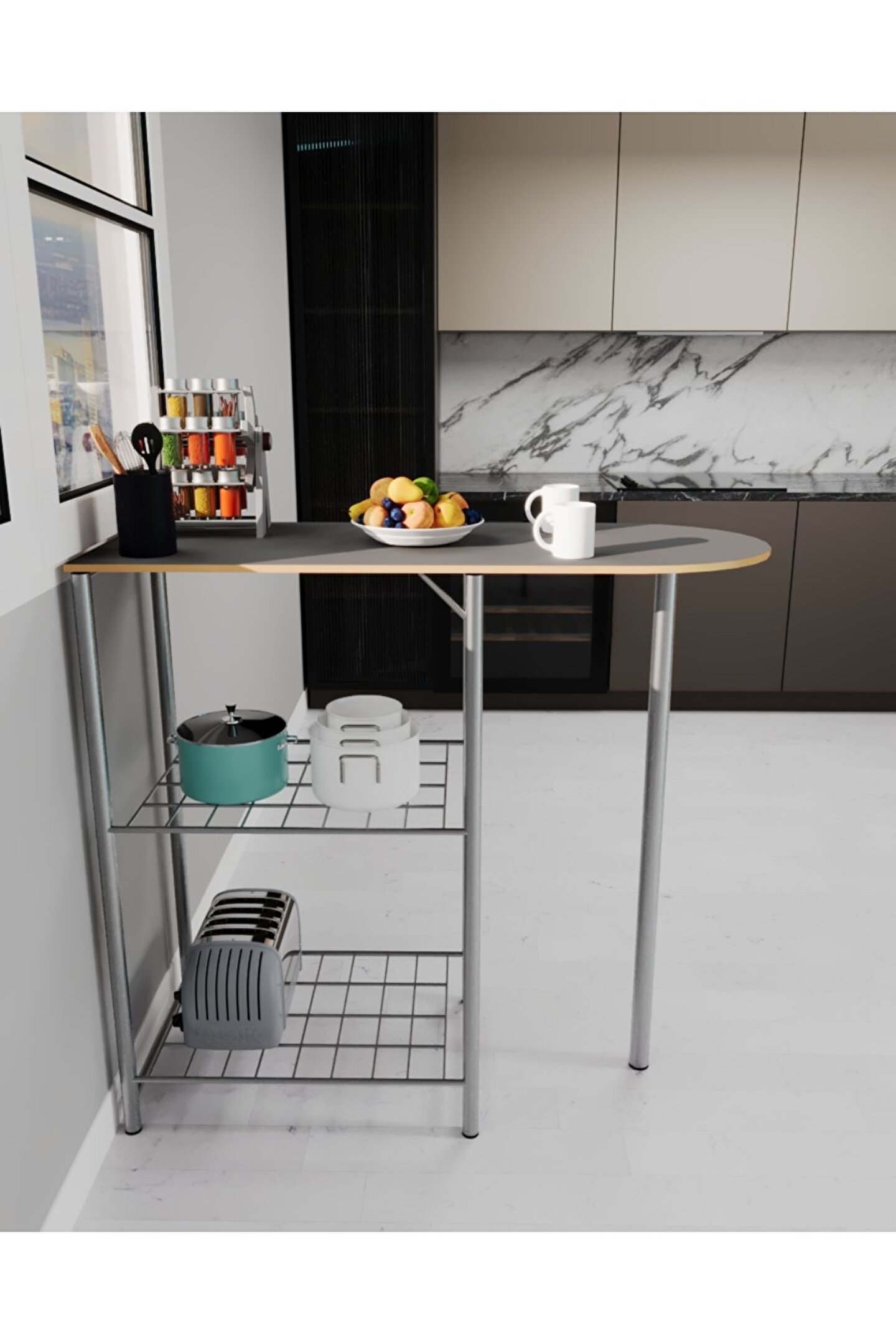 Mutfağa modern bir yapı ve fonksiyonel kullanım şekli kazandıran masa 100 cm uzunluk, 40 cm derinlik ölçülerindedir. ; 2 kişilik bar masasının alt kısmına entegre edilen raflar işlevsel özellik katarak özel depolama alanı kazandırır. Raflar arası yükseklik 40 cm, ölçüleri 36x55 cm’dir.; 18 mm kalınlığındaki üst tabla MDF malzemeden üretilir ve üzeri membran kaplamadır. Monoblok kaplama işlemi sayesinde bakteri oluşumu önlenir ve hijyenik kullanımı destekleyen bir yapı elde edilir. ; Yerden itibaren 90 cm yüksekliği bulunan modelin yanlarına harici bar sandalyesi veya tabure konumlandırarak rahat kullanım şekli gösterir. Özel bir yeme içme deneyimi yaşatarak yaşam alanınızda fazla yer kaplamaz. ; Bir kenarı düz, bir kenarı oval yapıda olan masa hafifliğiyle istenen her yere kolay taşınır. Portatif kullanıma elverişli tasarımıyla iç mekanların yanı sıra korunaklı dış mekanlarda da aktif şekilde yararlanma avantajı sunar. ; Tel şekilli raflar, sık kullanılan mutfak malzemelerine anında erişim imkanı verir. Destekli ayaklar tüm zeminlerde dengeli duruş sergiler.; Gri renkli modern tasarımlı model ortamdaki diğer eşyalara uyum sağlayabilir. Pürüzsüz yüzeyi kimyasal madde gerekmeden bez veya süngerle silinerek temizlenebilir.; Ayak uçlarındaki plastik pabuçlar zemin materyalinin çizilmemesini sağlar.; Kullanım amacına uygun dayanıklı materyallerden üretilen mutfak bar masası uzun süre kalitesini koruyabilir.;