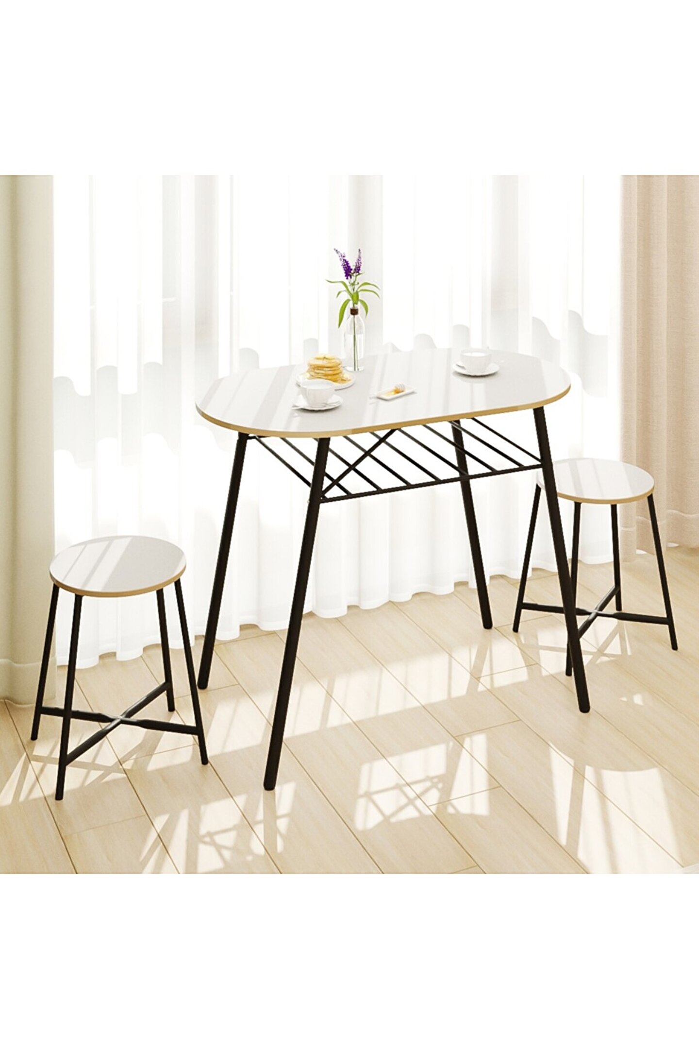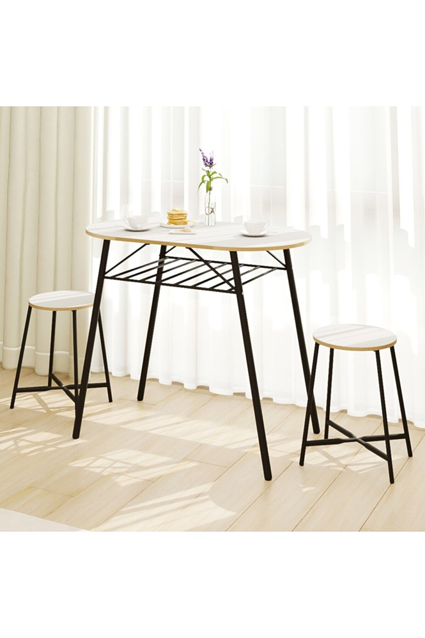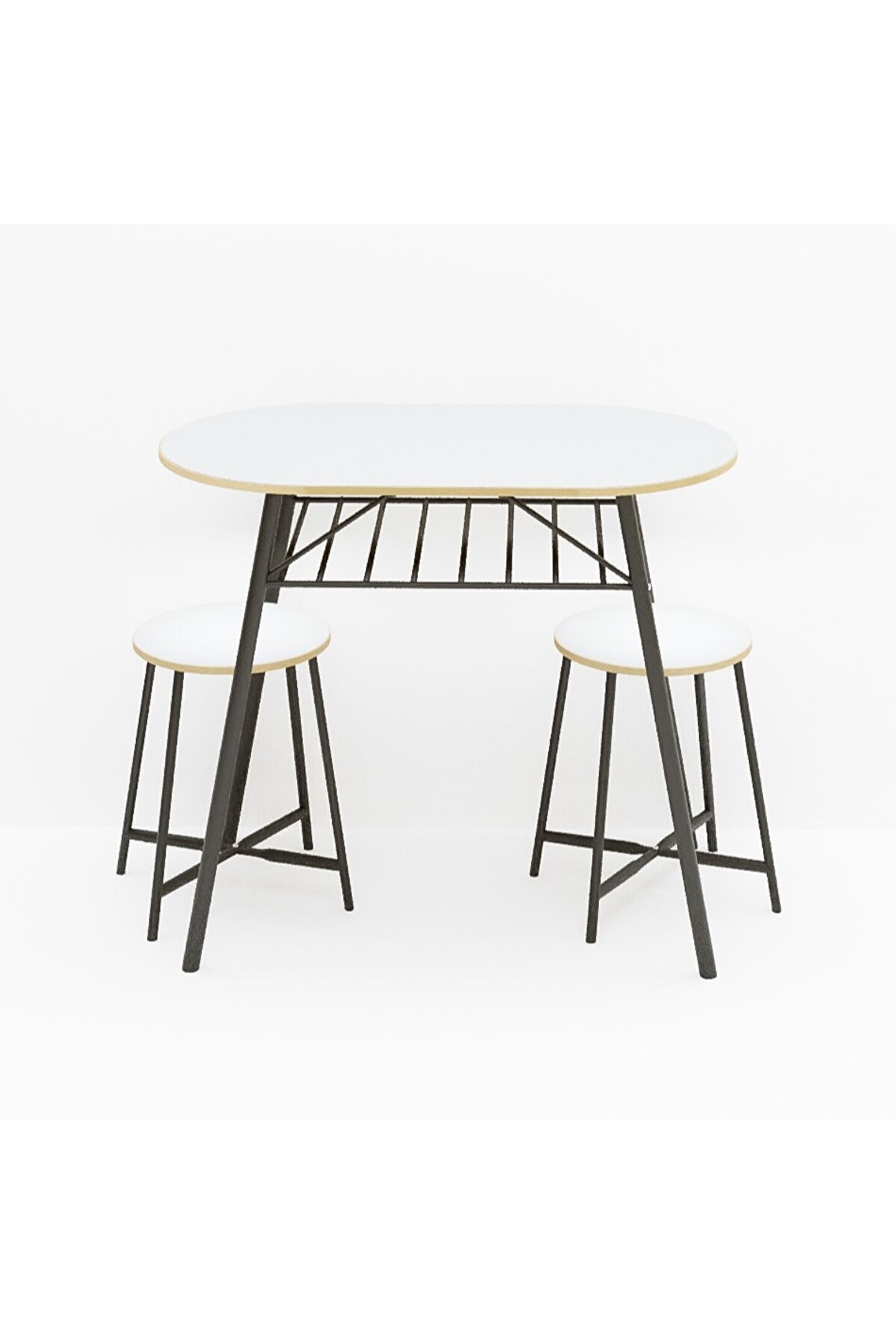 Mutfak Masası Oval Tabure Takımı Masa Sandalye Takımı Beyaz ı, iki kişilik bir set olarak gelir ve içeriğinde bir adet oval masa ile iki adet tabure bulunur. Bu parçaların her biri, hem salon hem de mutfak gibi çeşitli yaşam alanlarınıza uyum sağlayacak şekilde estetik bir tasarıma sahiptir. Modern ve minimalist görünümü, herhangi bir oda dekorasyonunu kolaylıkla tamamlar.