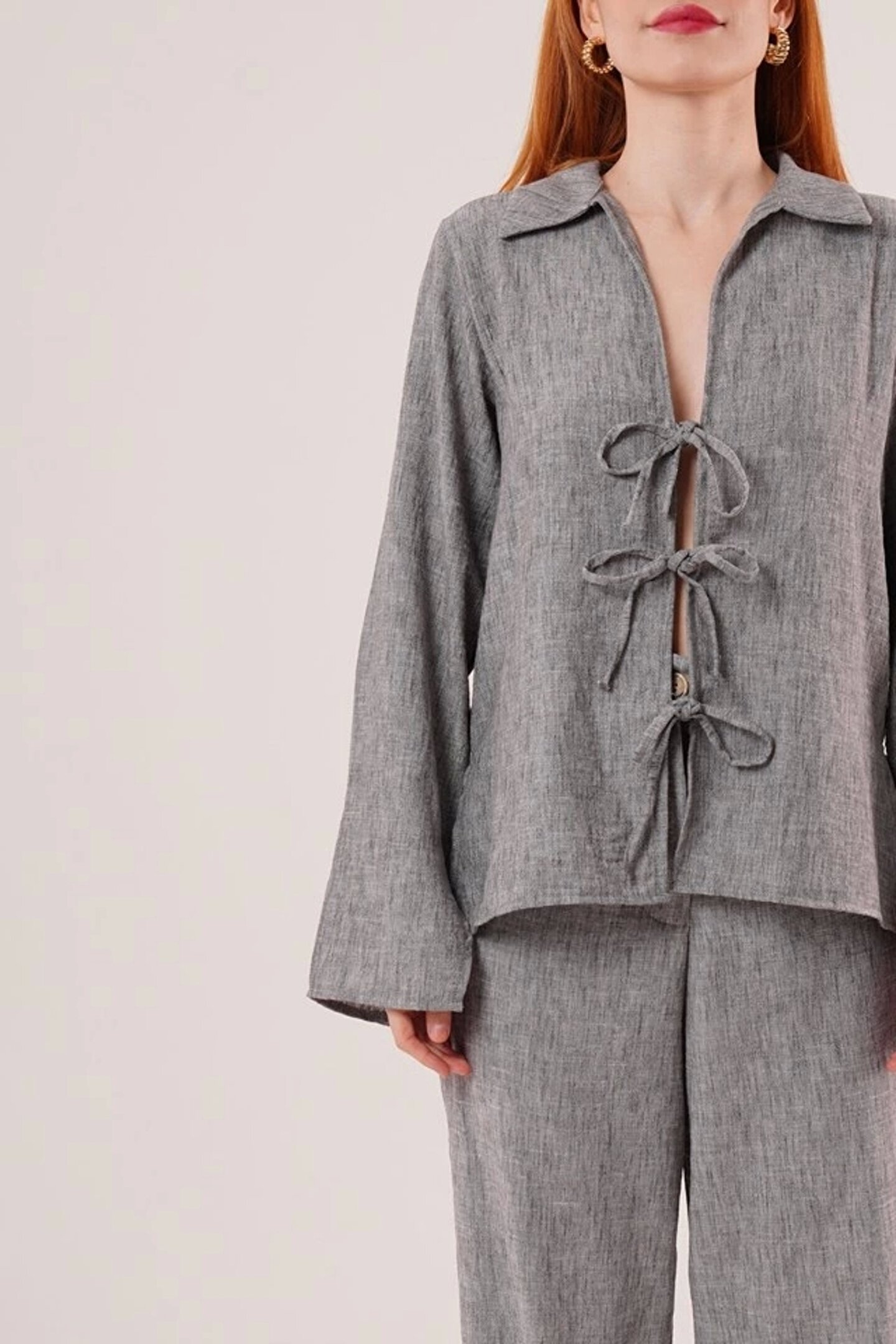 Ön Bağlama Detaylı Pantolon Ve Gömlek Antrasit İkili Takım