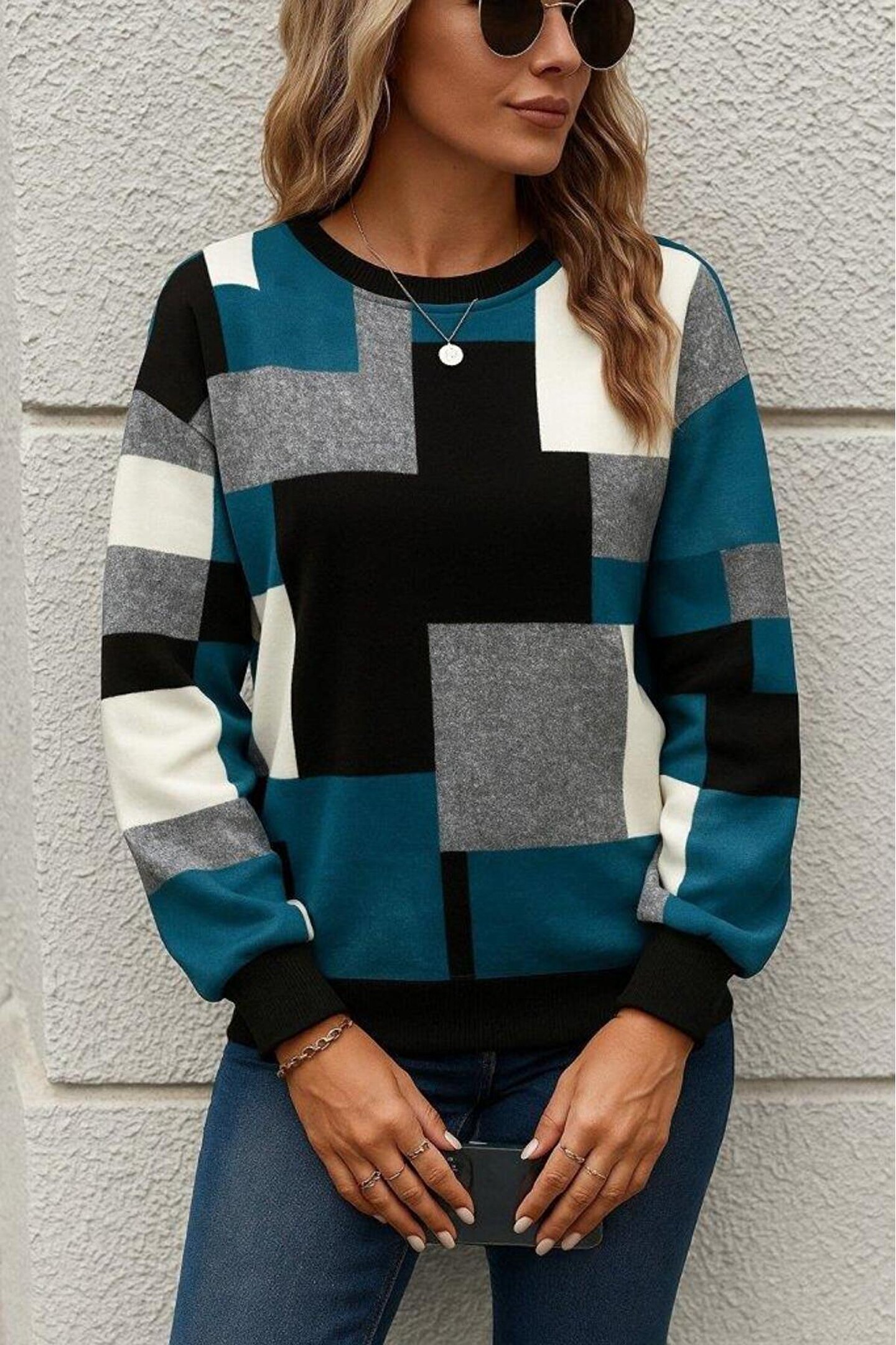 EQURİ Kadın Uzun Kollu Bisiklet Yaka Renkli Blok Baskı Dalgıç Bluz