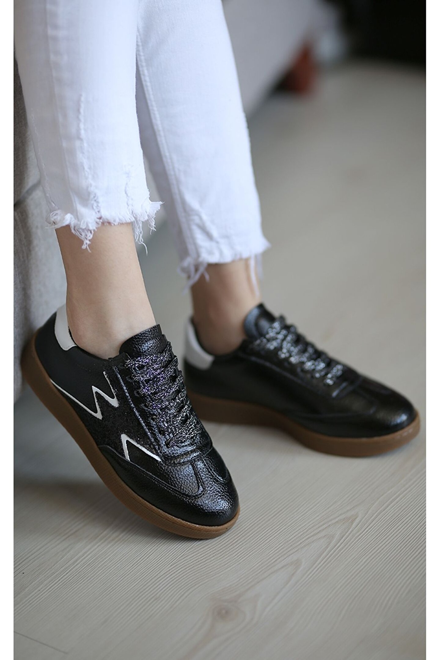 ALYA Bağcıklı Ortopedik Taban Taşlı Kadın Sneaker Spor Ayakkabı CBT - Siyah
