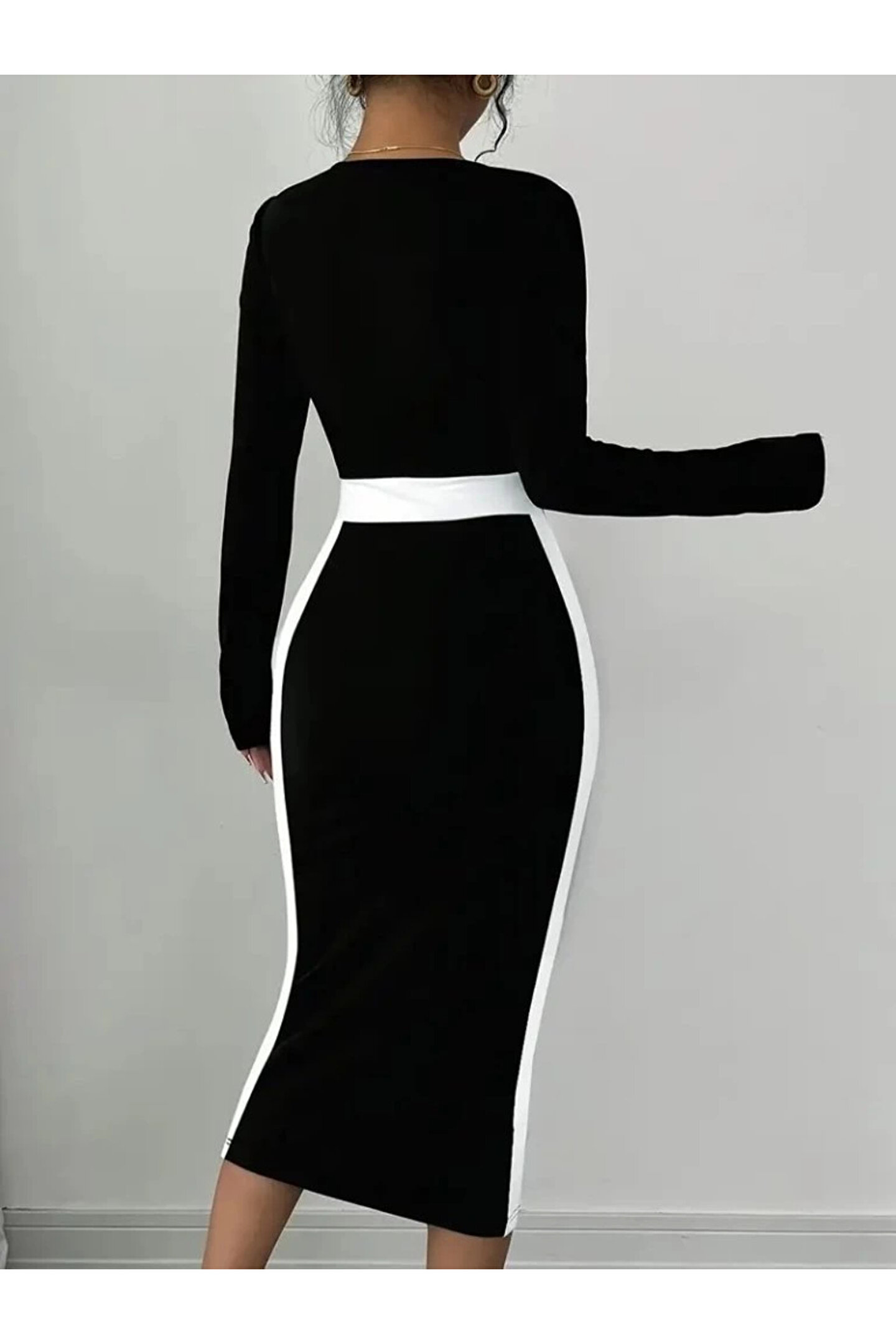 ermege MDB Kadın Uzun Kollu Geometrik Yaka Midi Ithal Krep Elbise