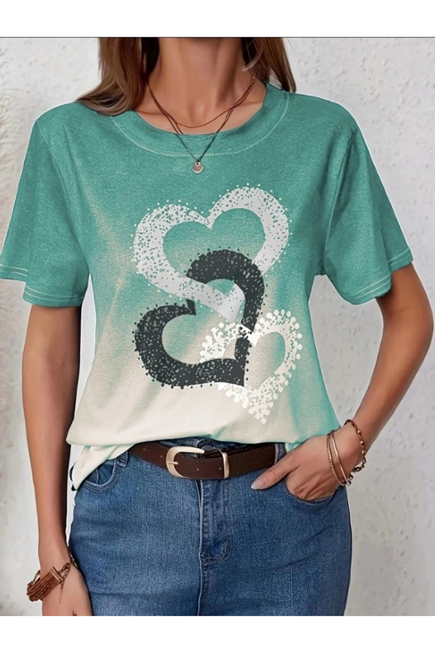 ESSE BUTİK Kadın Kısa Kollu Bisiklet Yaka Kalp Baskılı Süprem Bluz