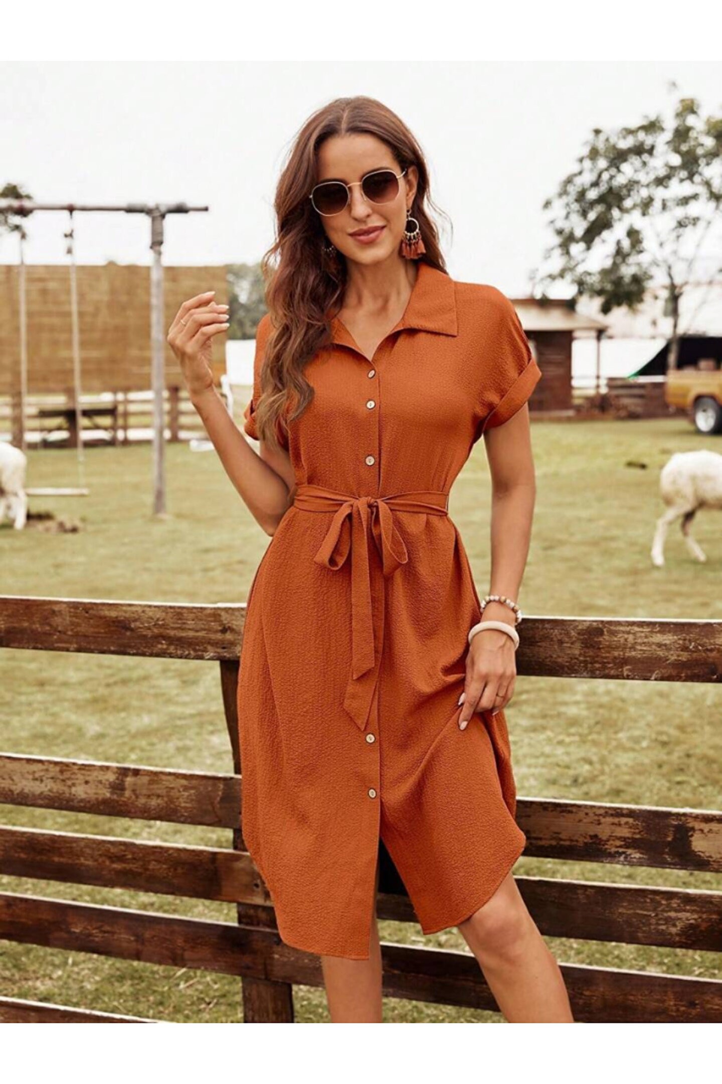 ESSE BUTİK Kadın Kısa Kollu Yakalı önden Düğmeli Beli Kuşaklı Bürümcük Elbise