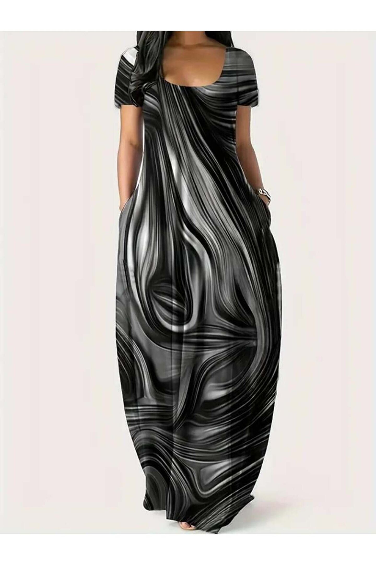 ESSFASIHON Kadın Kısa Kollu Yuvarlak Yaka Cepli Salaş Baskılı Süprem Elbise