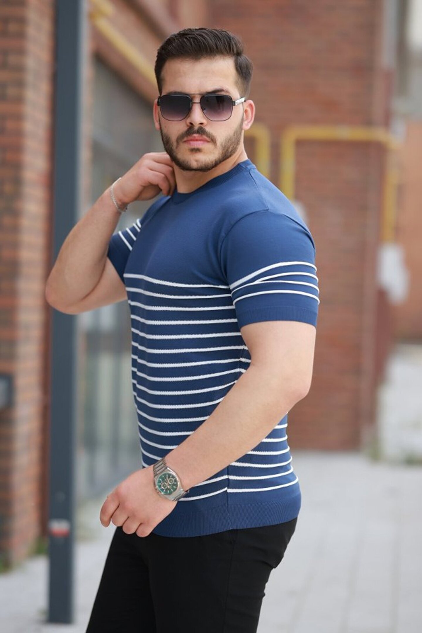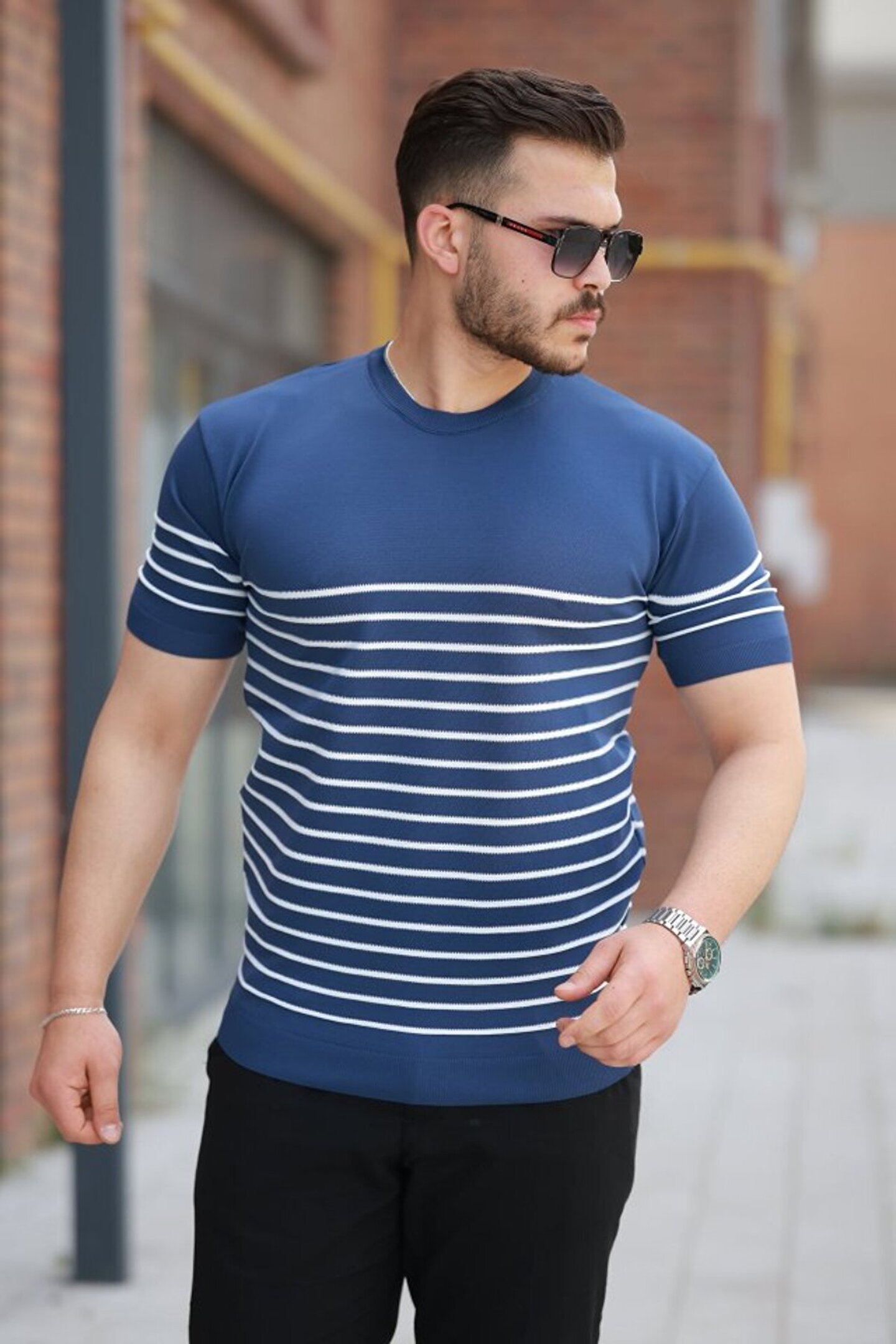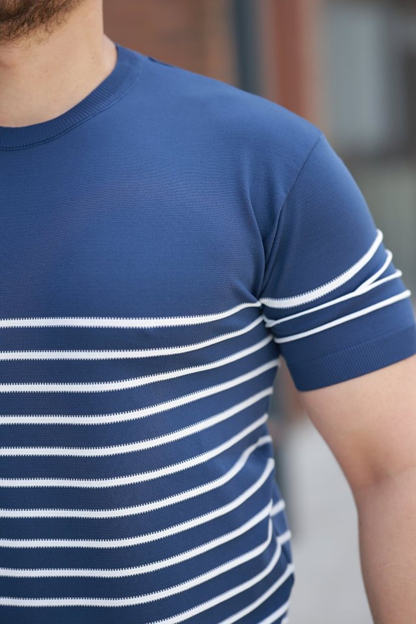 ETİLER COLLECTION EQURİ Erkek çizgi Desenli Bisiklet Yaka Kısa Kollu T-sihrt
