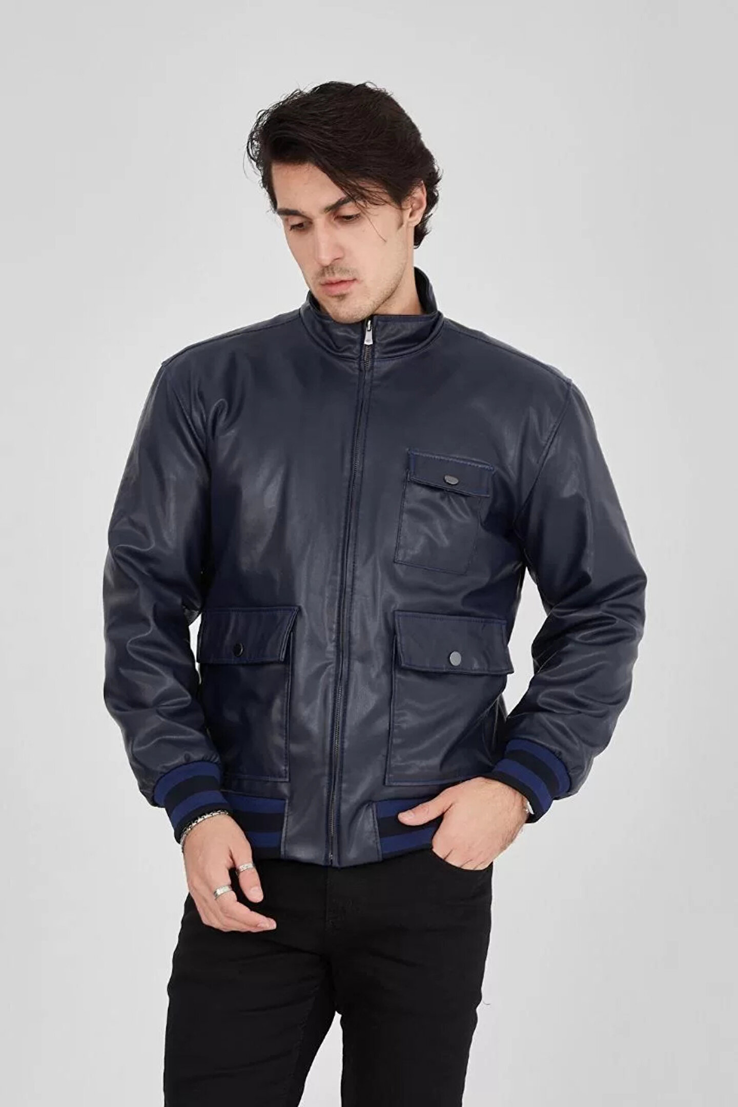ETİLER COLLECTION Erkek Fermuarlı İçten Elyaf ve Astarlı Suni Deri Ceket - Lacivert