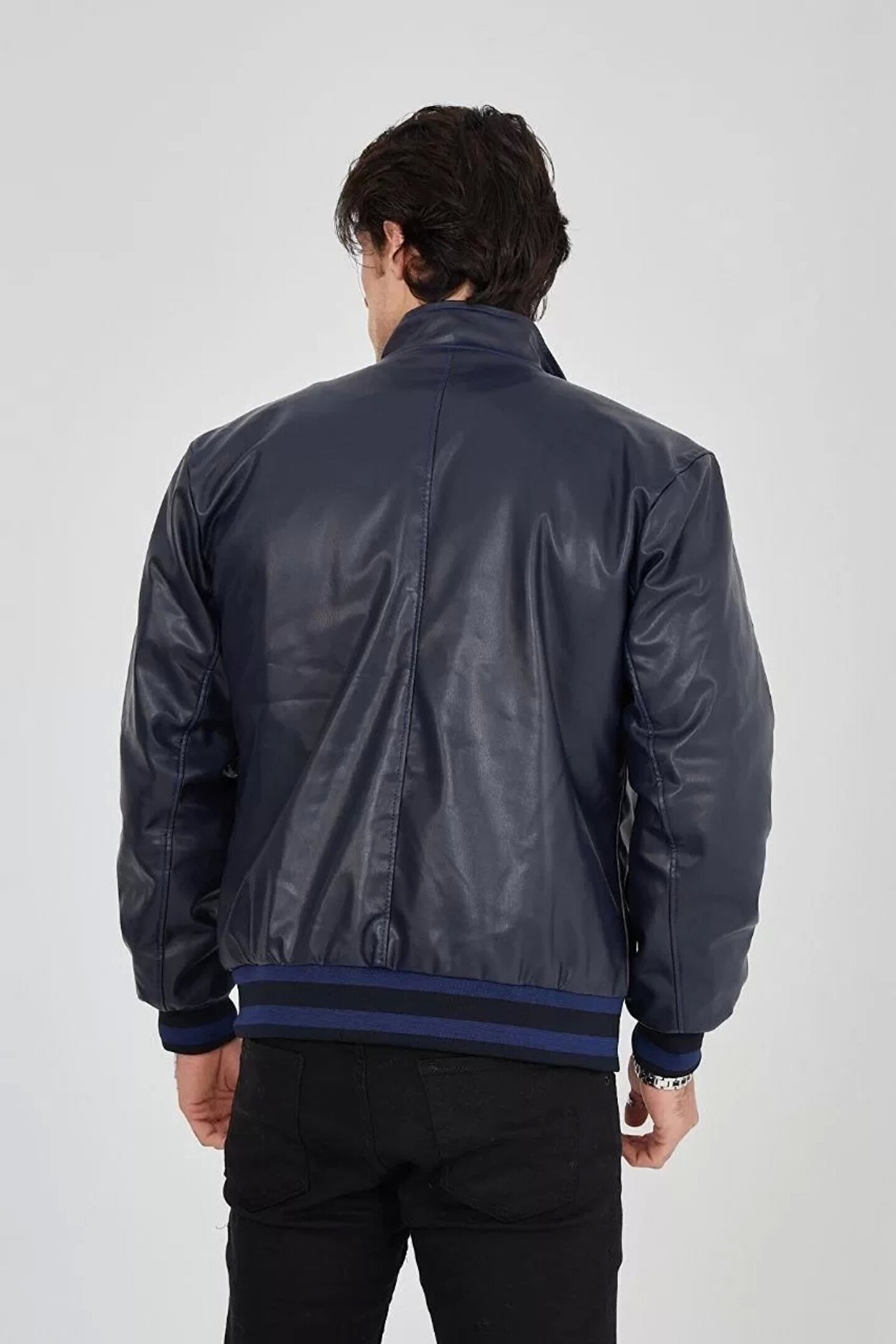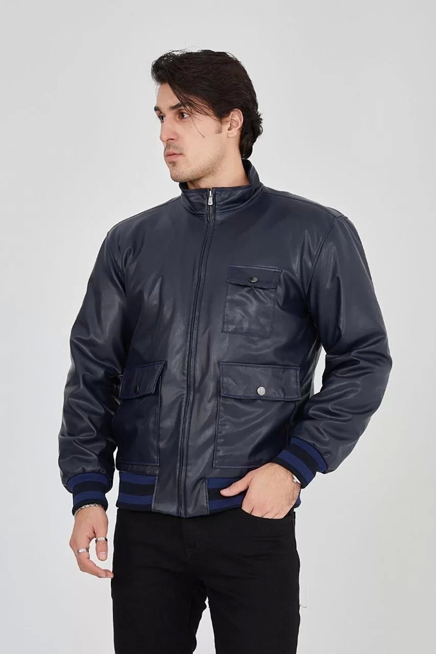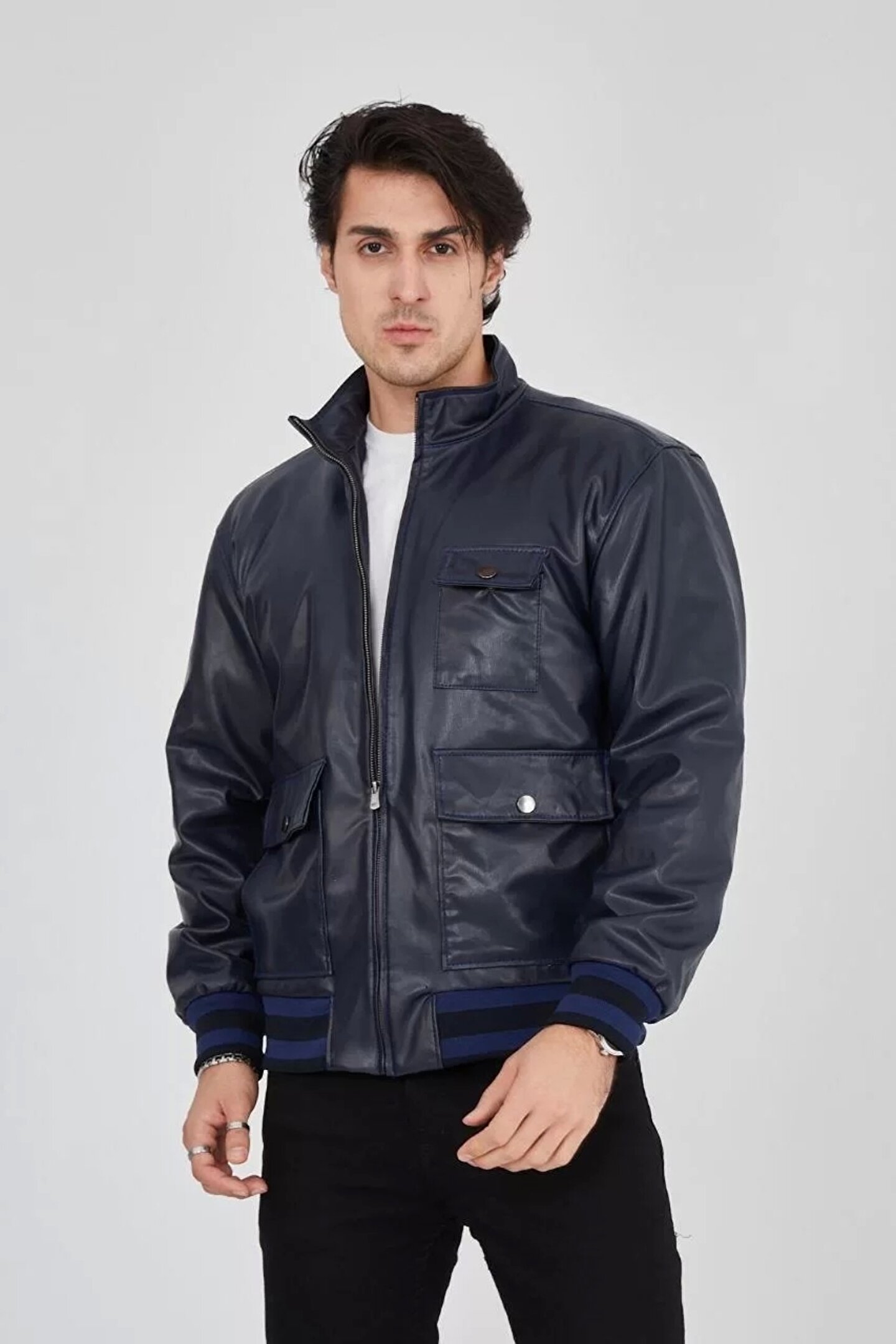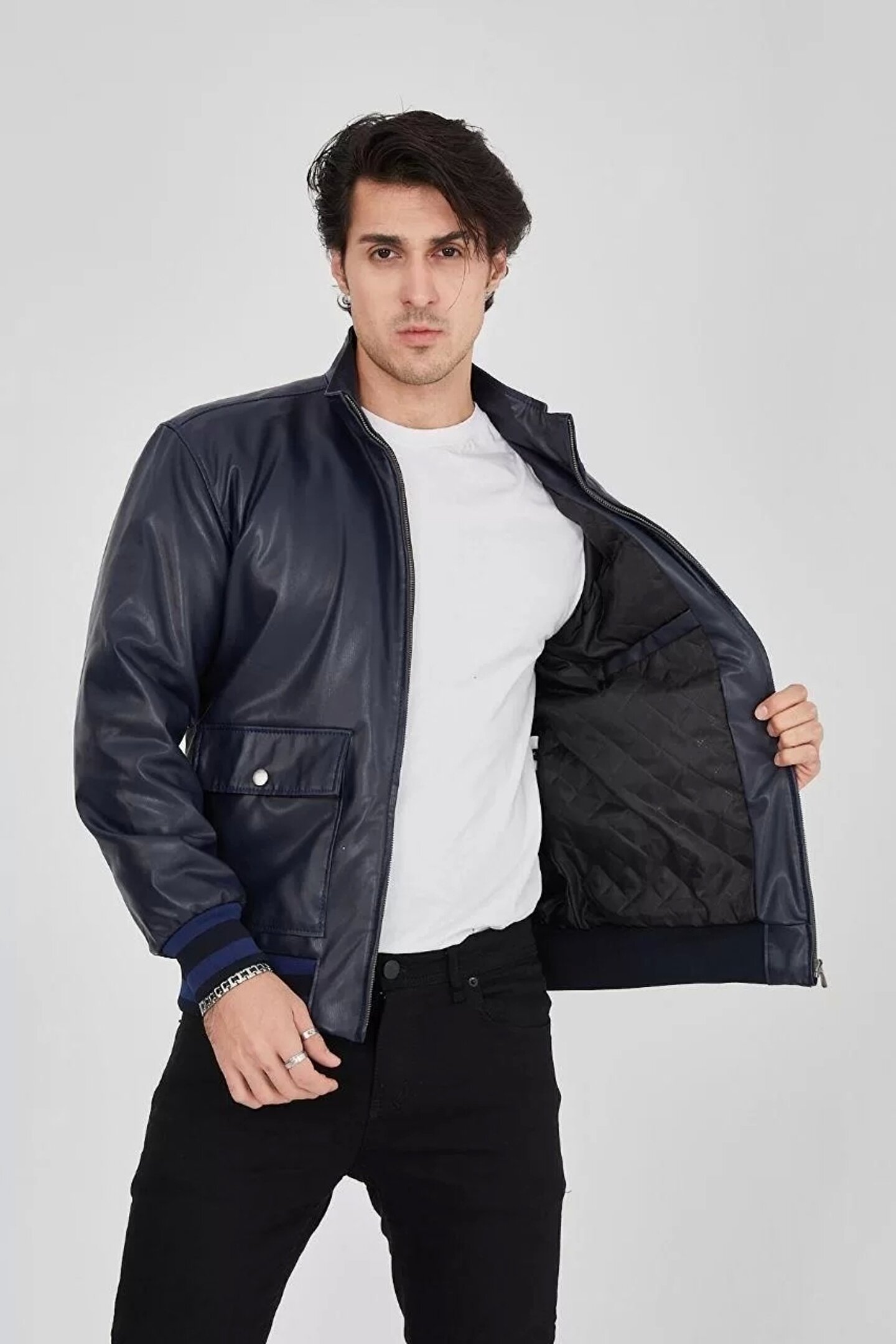 ETİLER COLLECTION Erkek Fermuarlı İçten Elyaf ve Astarlı Suni Deri Ceket - Lacivert